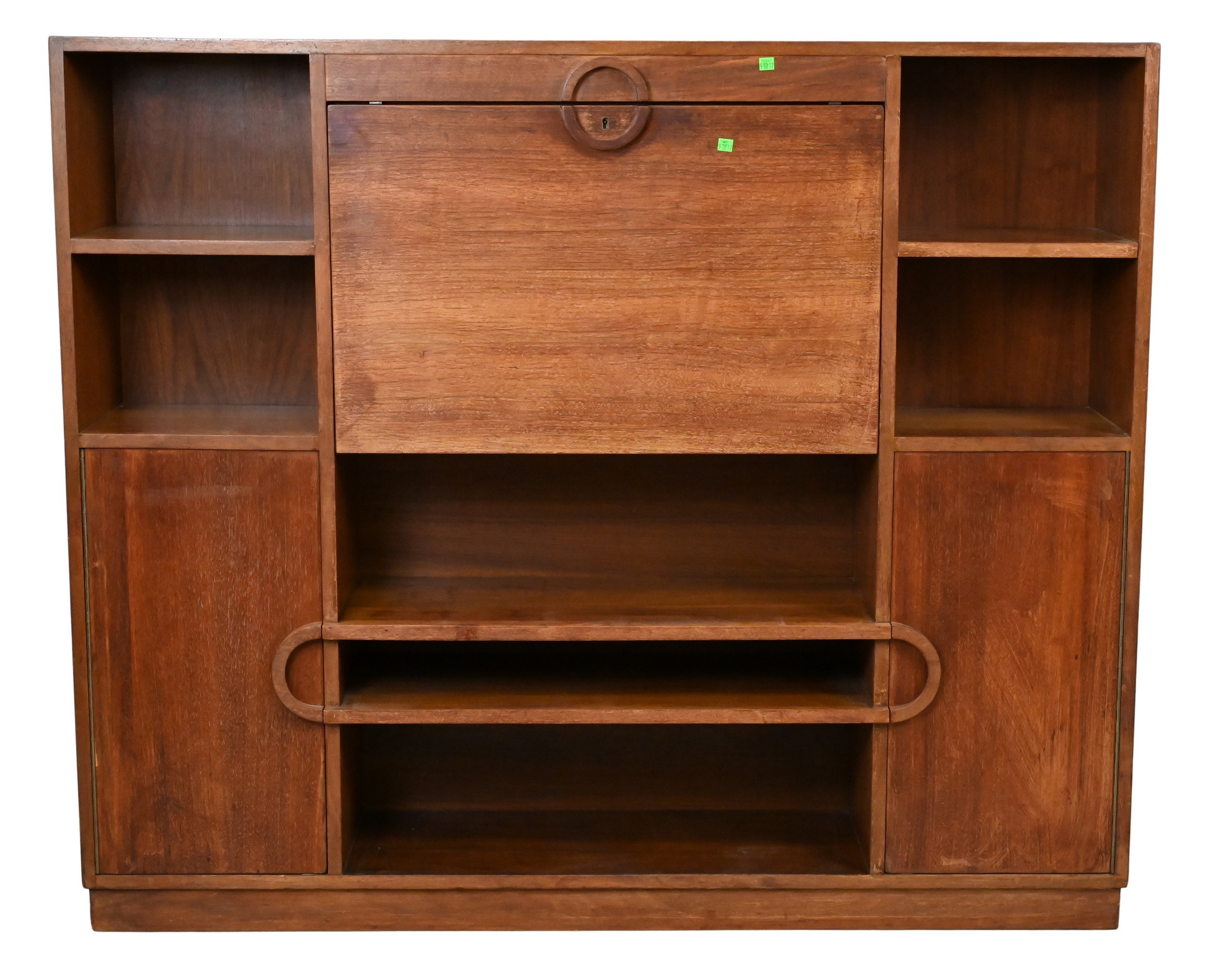 having drop front desk flanked by bookcase cubbies