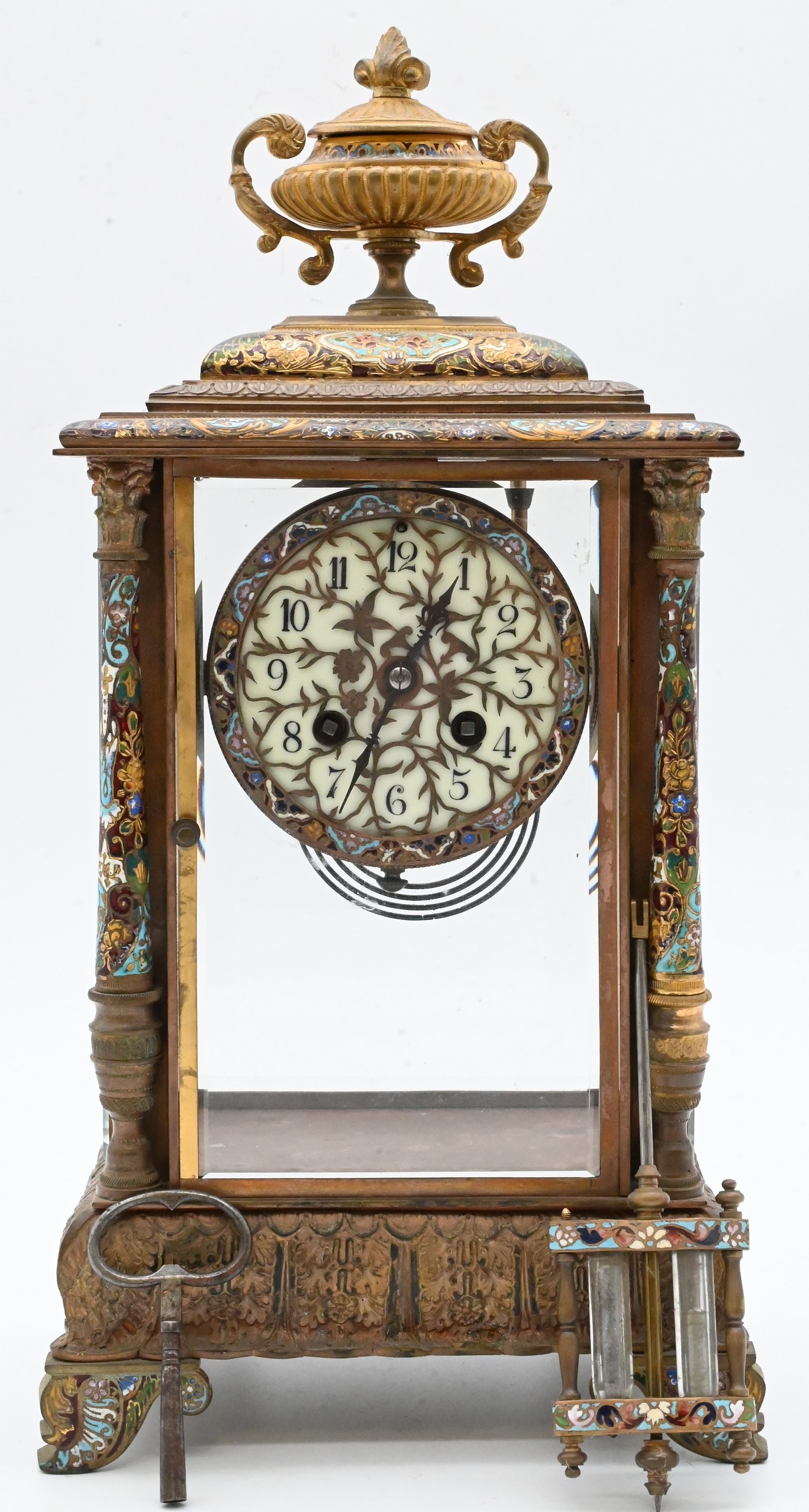 having urn pediment atop case, complete with key and pendulum