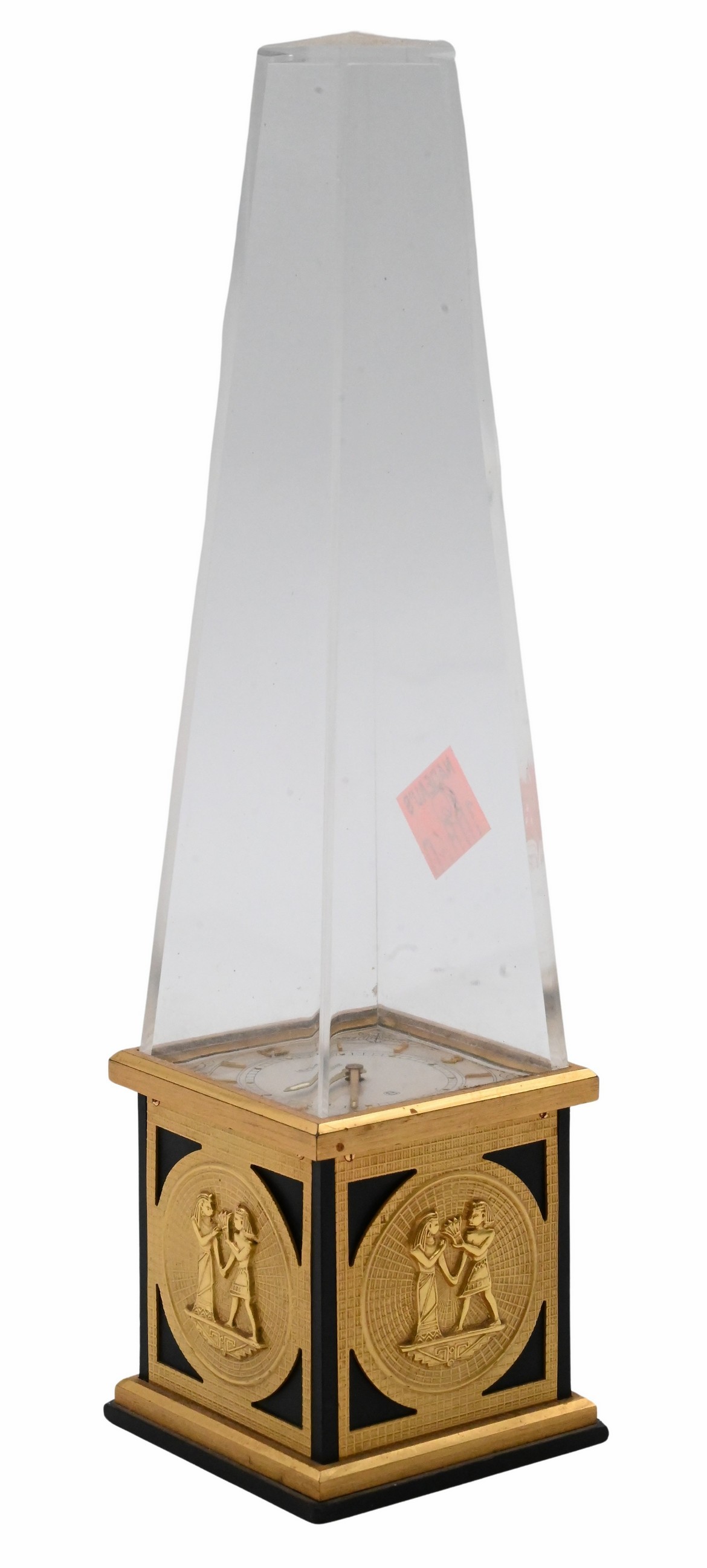 Egyptian revival style 8 day movement desk clock with transparent obelisk-form dome rising from a gilt brass stand decorated in low relief, the square white dial displays gilt Arabic numerals and baton indexes, signed Jaeger and Swiss Made, with movement marked 462, circa 1920–1930