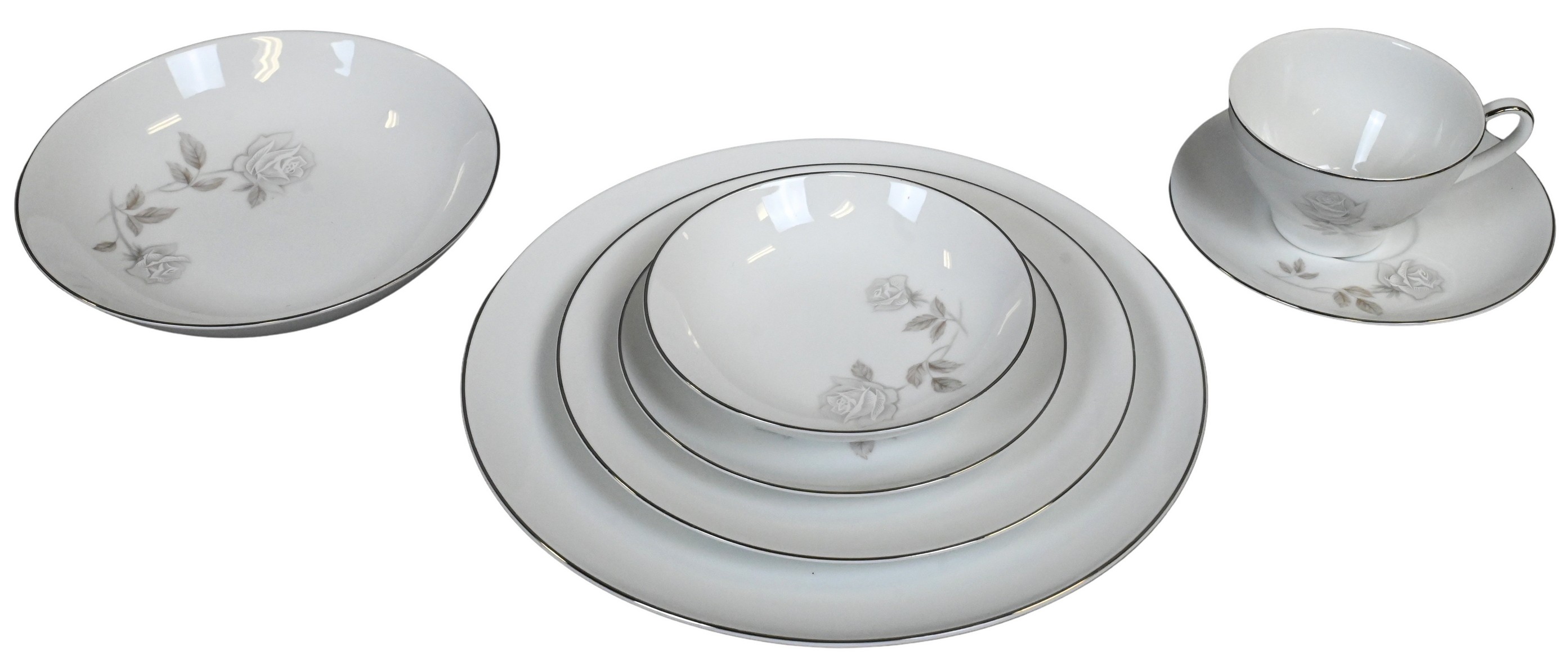 including dinner plates (diameter 10 1/2 inches), teacups, saucers, bowls, serving pieces, along with frosted hanging light