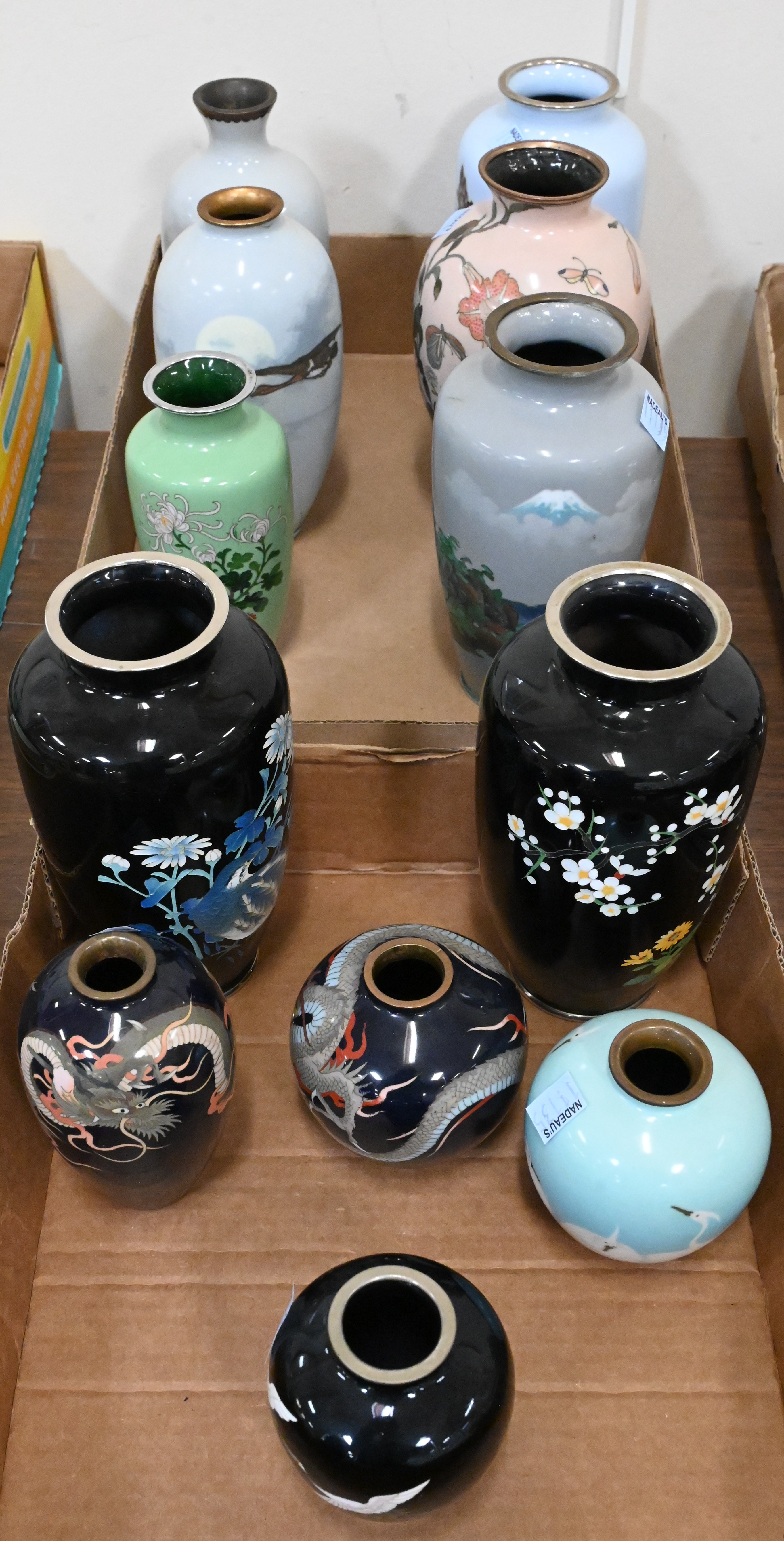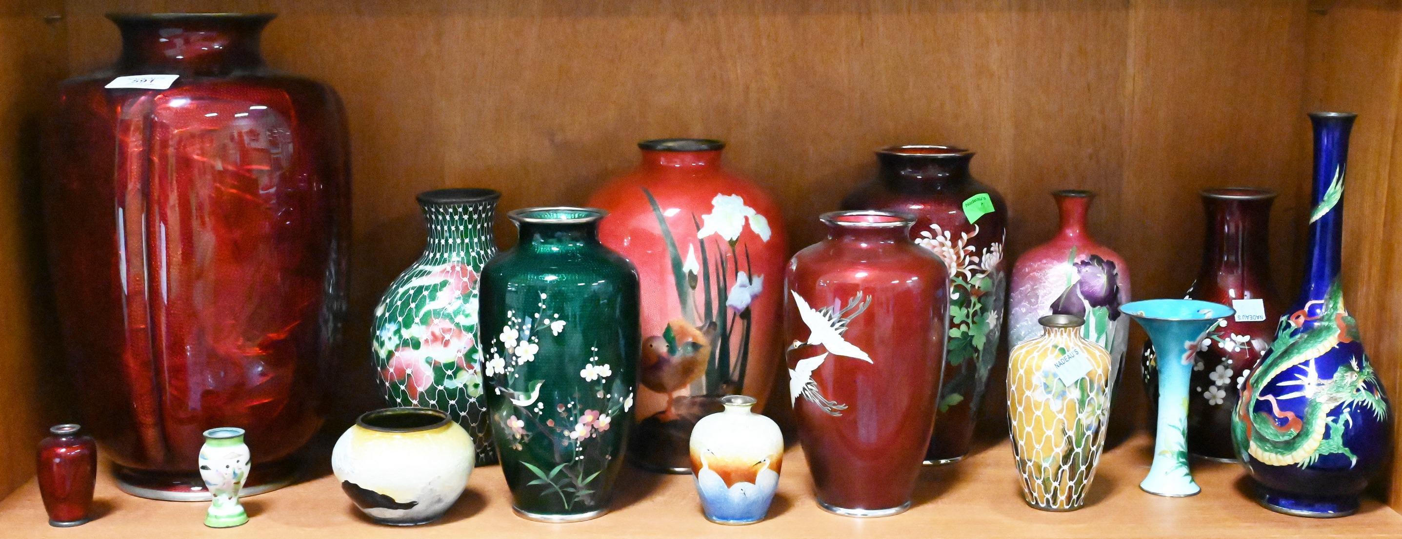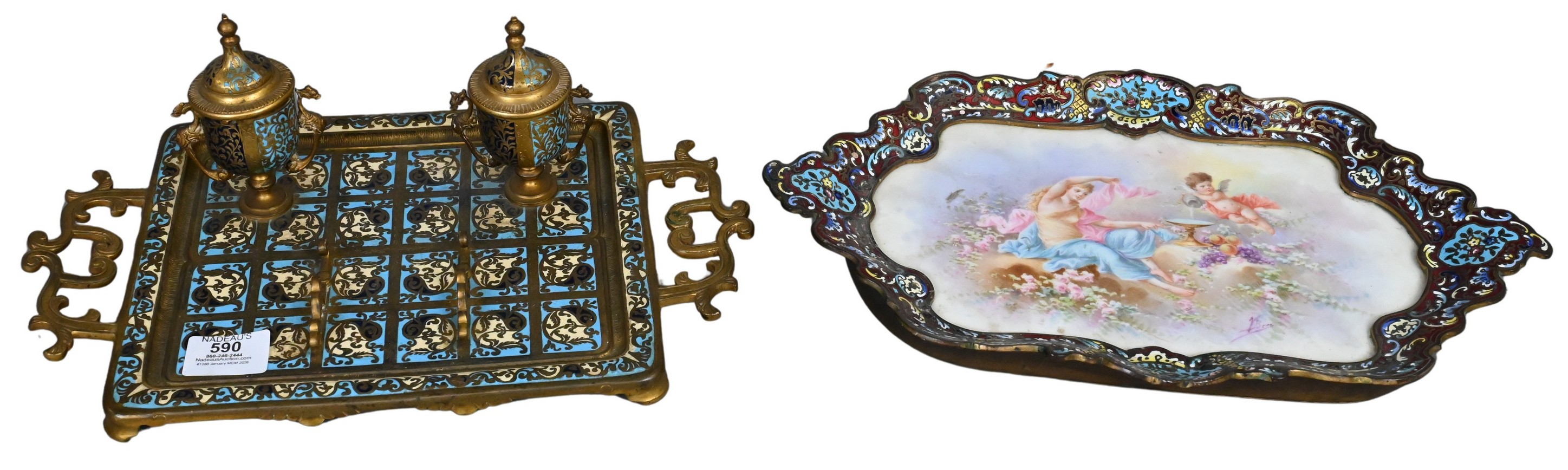 including a shaped enamel tray centered with allegorical scene depicting a reclining female figure attended by cherubs, within an elaborate scrolling border heightened with enamel and gilt; together with a rectangular inkwell tray, richly ornamented with blue and gilt champlevé panels and dragon figural handled inkwells