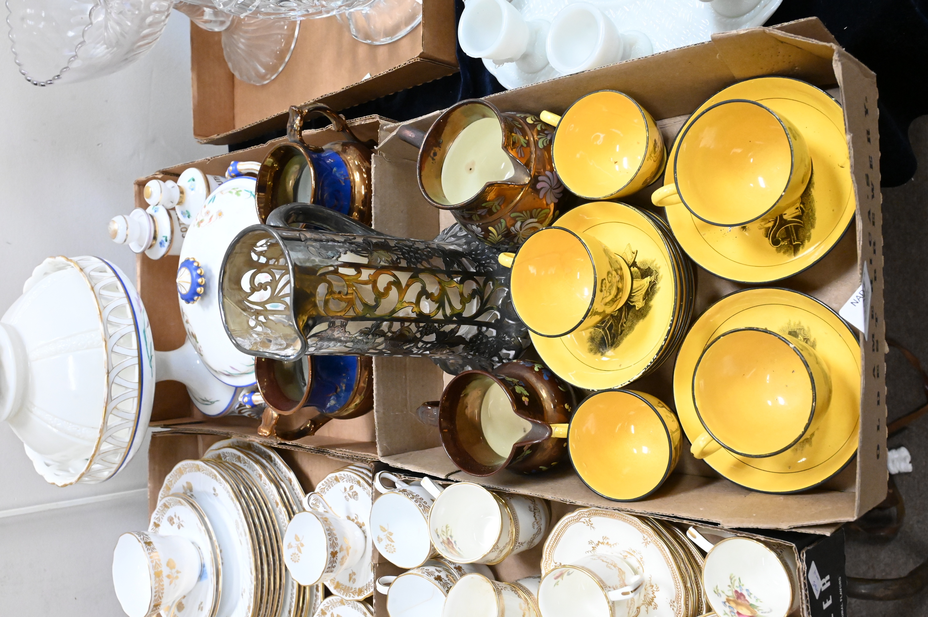 including yellow lustreware cups and saucers, silver overlay pitcher (as is), lusterware pitchers, a covered porcelain centerpiece with jars, and milk glass, covered jars and egg cups