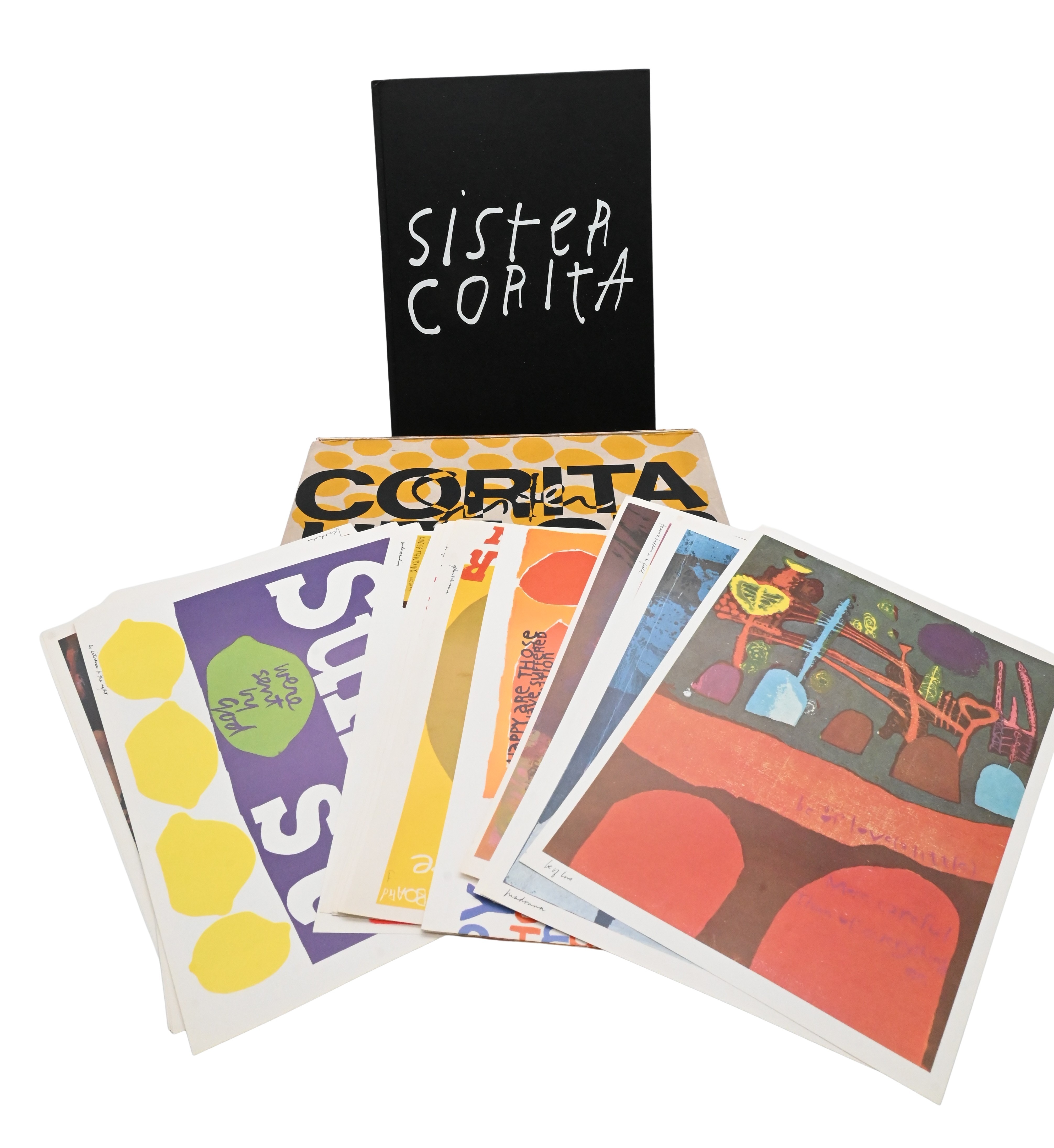 Group includes an original Sister Corita Kent screenprint portfolio, “Sister Corita”, published by Pilgrim Press, Philadelphia/Boston, featuring bold graphic compositions with hand-lettered text and Pop-inspired imagery, together with the illustrated artist’s book “The Besler Florilegium: Plants of the Four Seasons” (Abrams), reproducing early botanical imagery admired for its influence on Corita’s visual language.