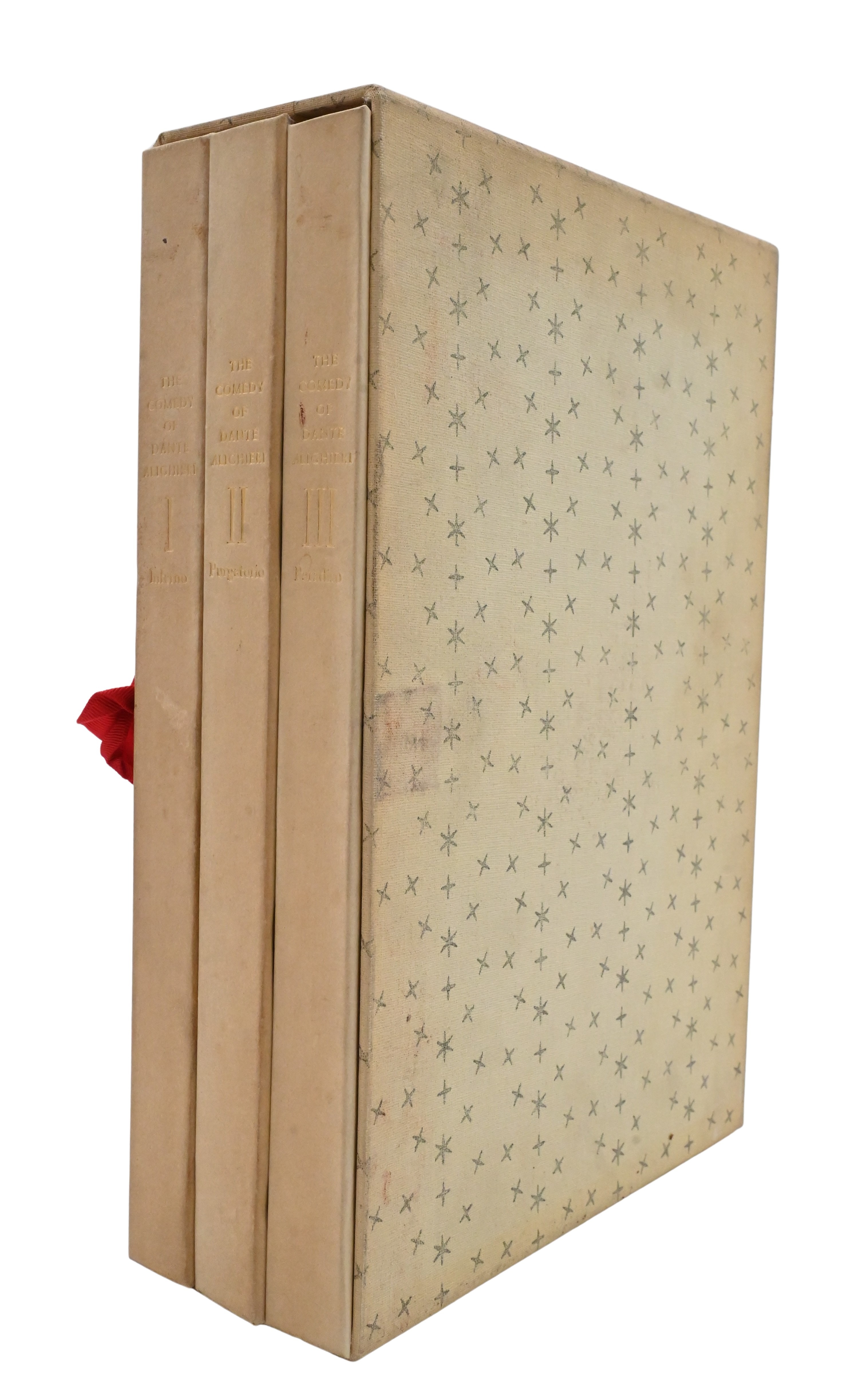 Three-volume fine press edition of Dante’s Divine Comedy, translated into English unrhymed hendecasyllabic verse by Mary Prentice Lillie, published by The Grabhorn Press, San Francisco, 1958. One of 300 copies produced for the English-language edition. Printed with classic Grabhorn typography on fine paper, each volume presented in uniform cloth bindings with gilt spine lettering. Widely regarded as one of the most successful American fine-press interpretations of Dante, admired for its restrained design, scholarly translation, and craftsmanship.