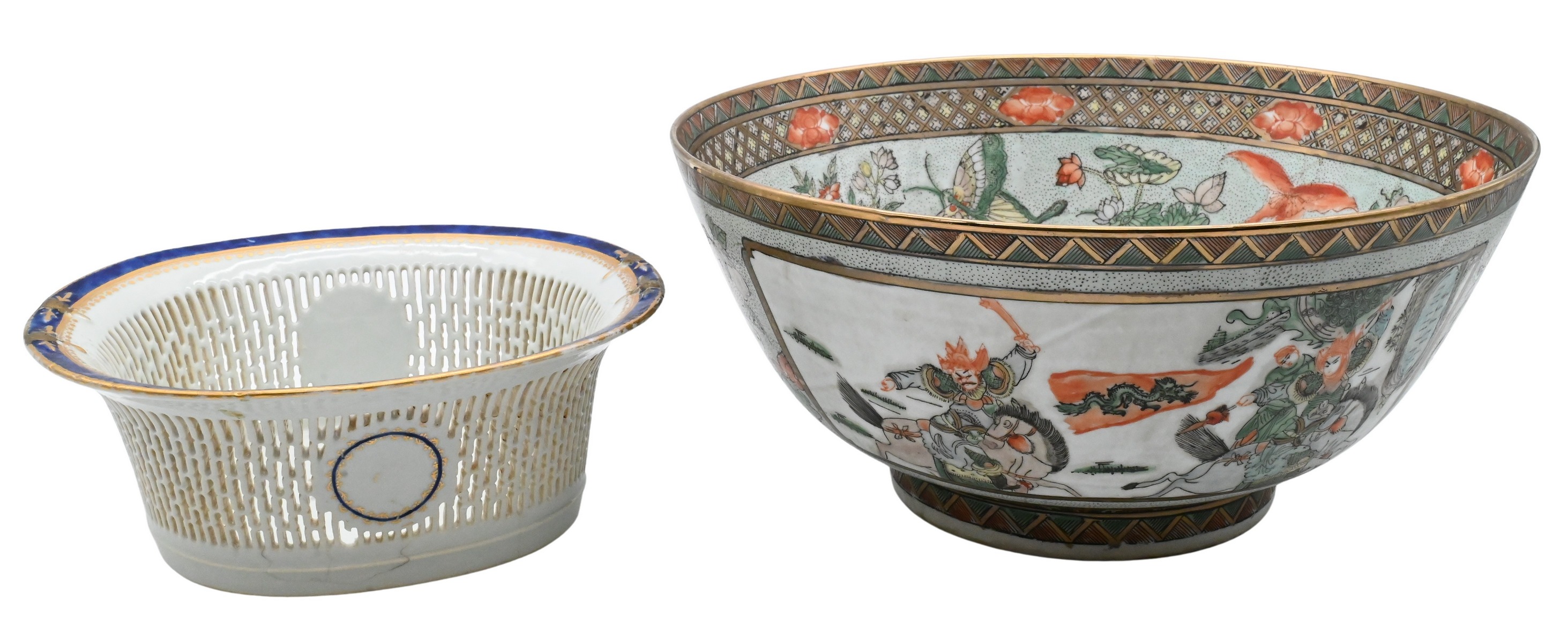 famille verte punch bowl with warrior on horseback motif, lotus flowers and butterflies along with reticulated basket with cobalt and gilt rim