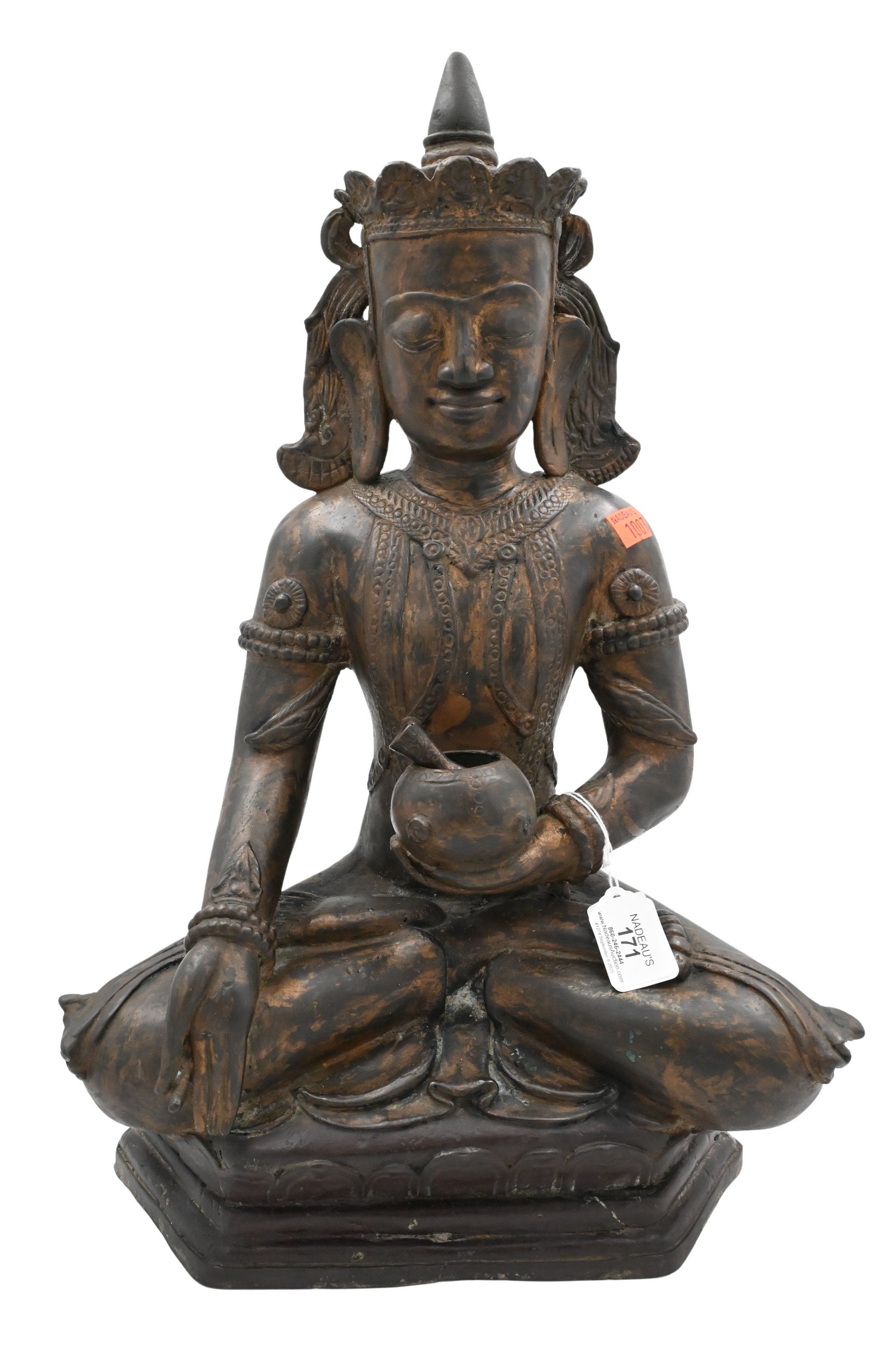 Southeast Asian style featuring crowned buddha holding a mortar and pestle set on carved wooden base