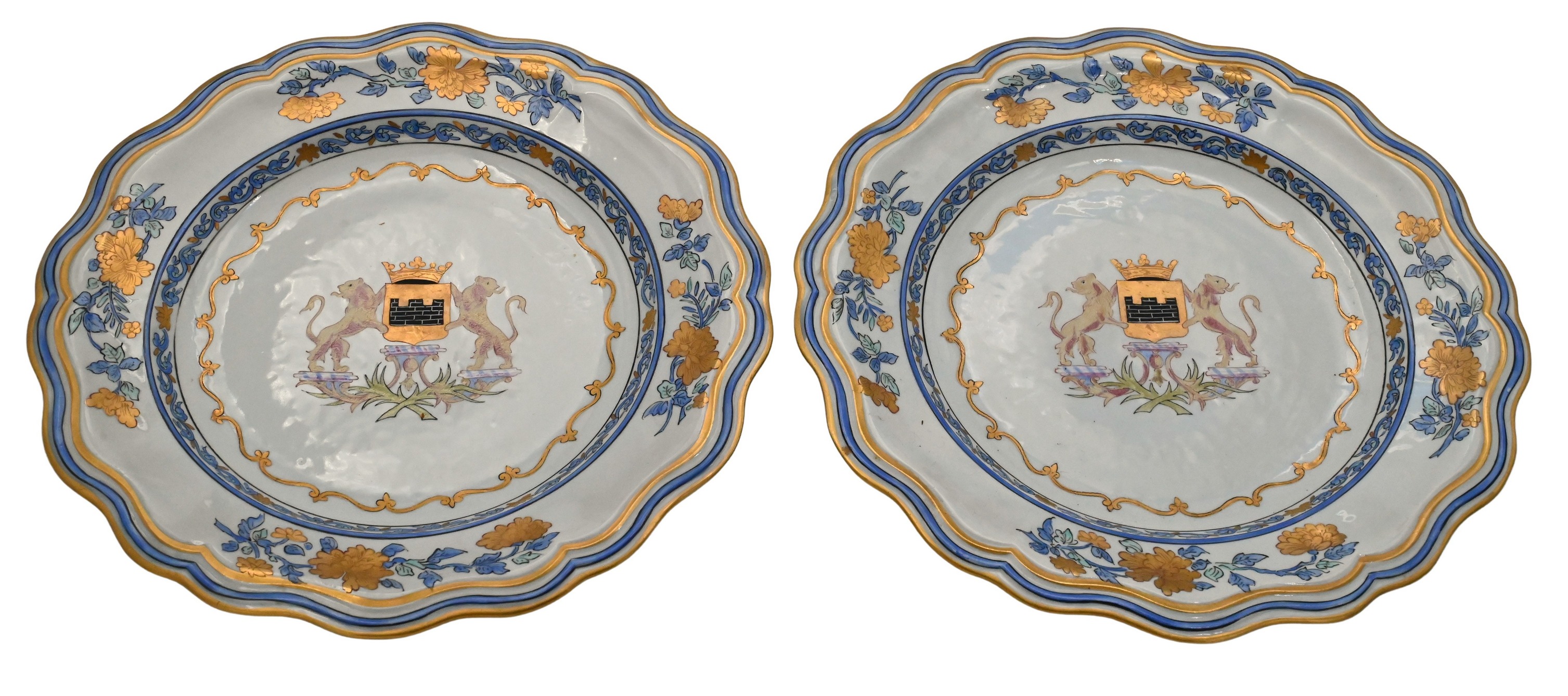 Each plate with scalloped, gilt-highlighted rim and blue-and-gilt floral border enclosing a central armorial device featuring a shield charged with a masonry tower beneath a coronet, flanked by lion supporters (unidentified arms). Typical Samson armorial decoration and palette.