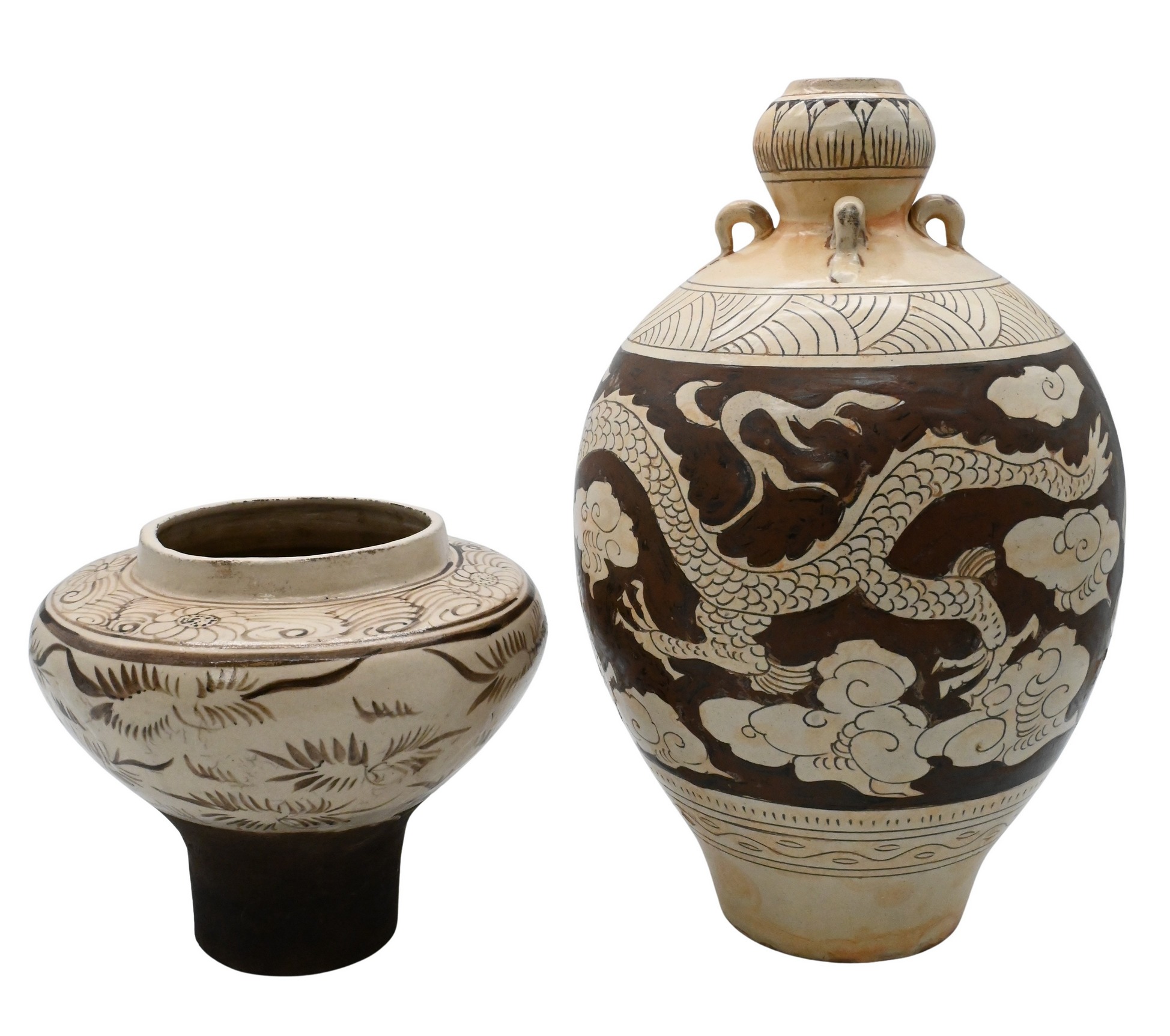 both of Meiping style and tapering form with black slip decoration on a cream ground, one with dragon and cloud motifs, height 20 inches, the other with bold floral design and goat, height 14 inches