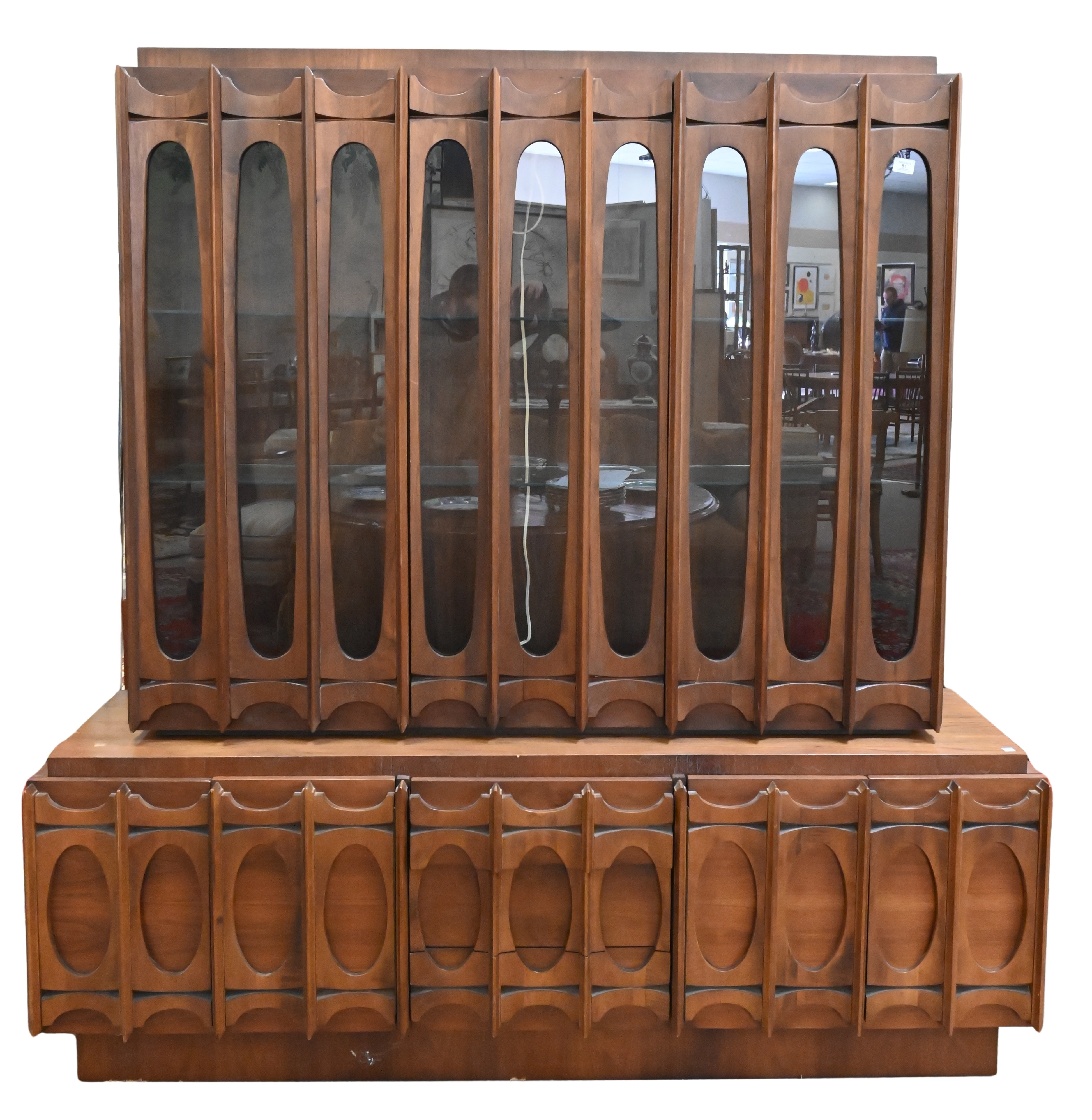 top having two glass doors opening to glass interior shelving set on base having three doors