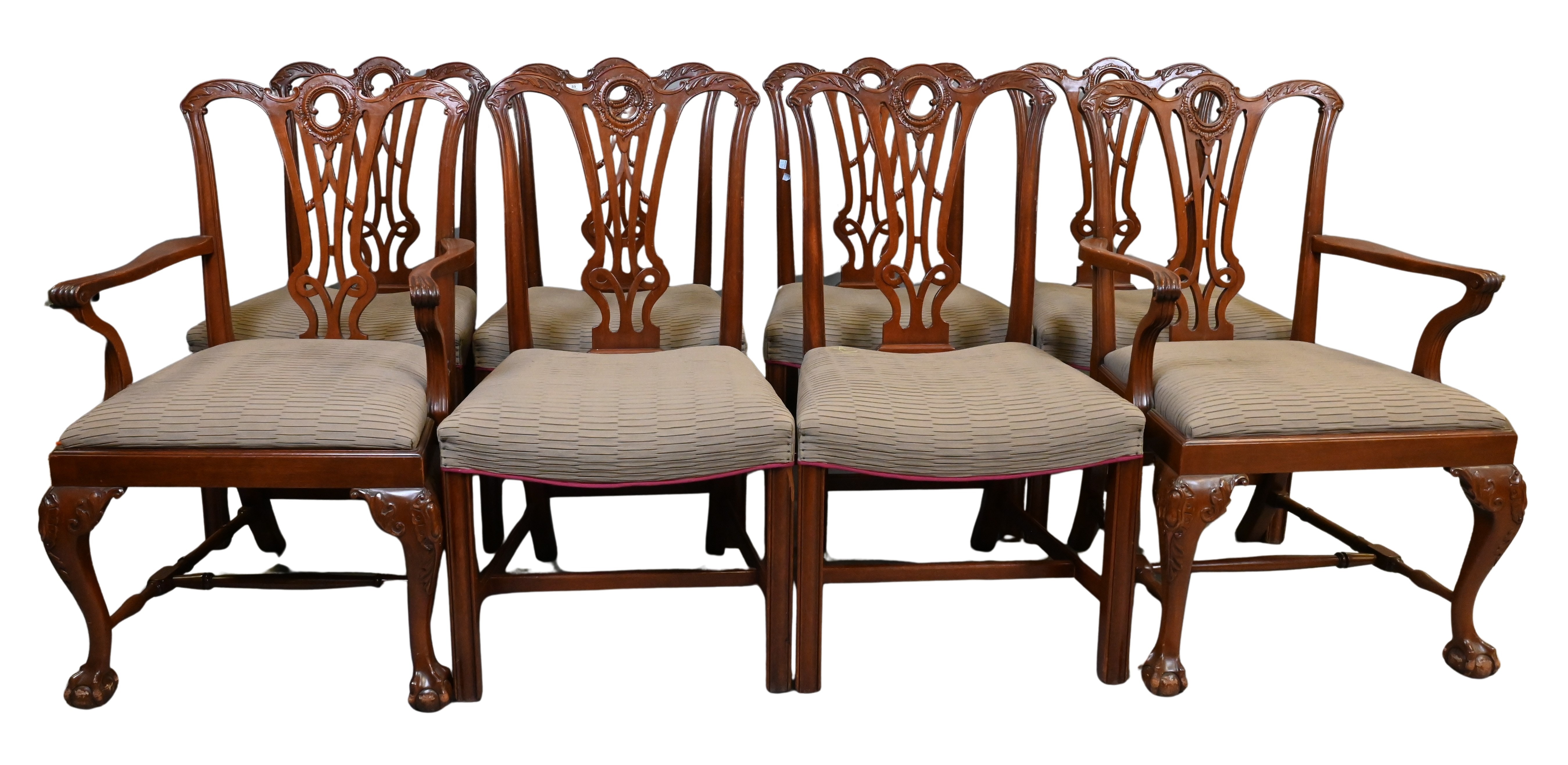 two chairs arms with ball and claw feet and six side chairs with molded legs