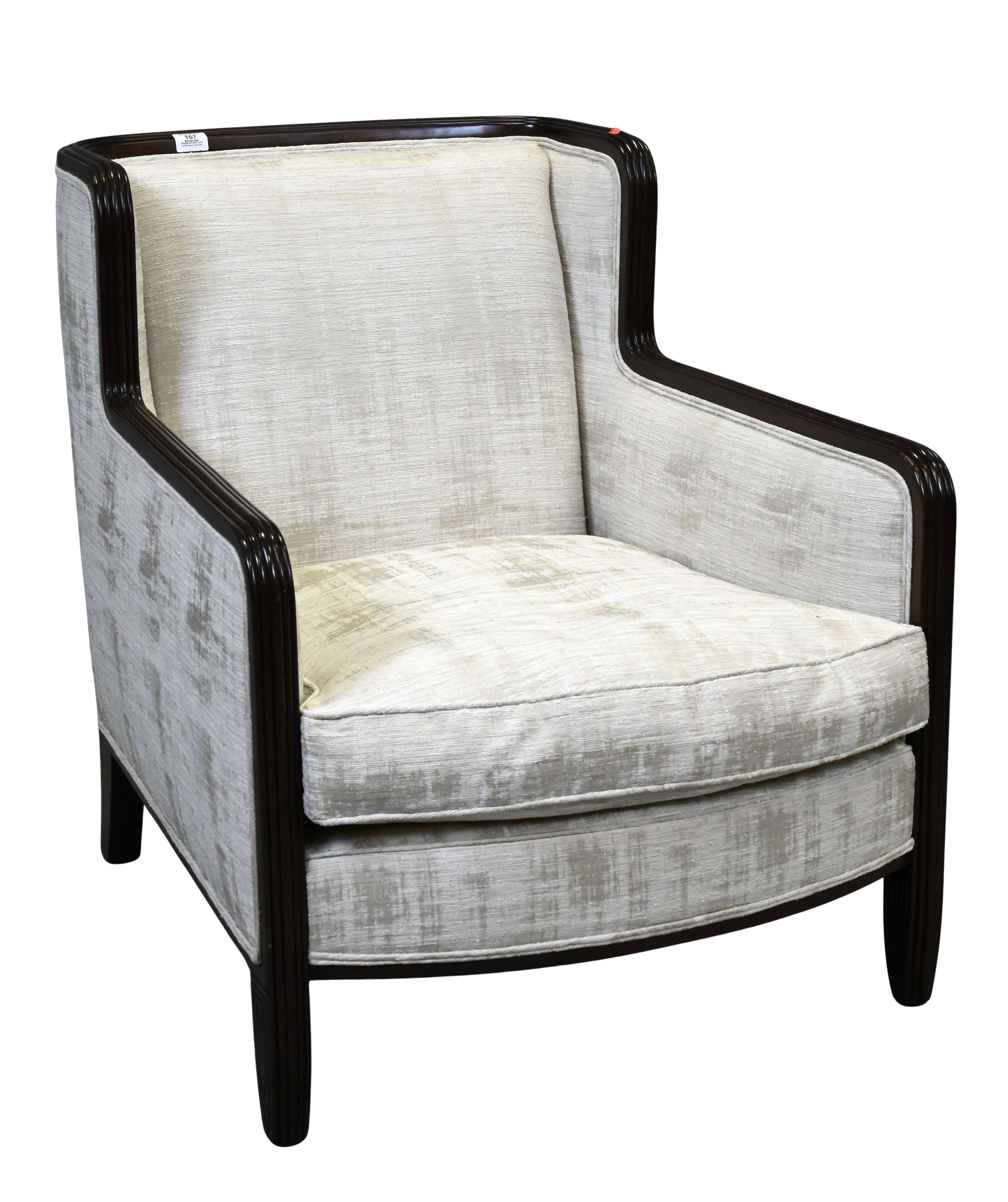 having old reupholstery tag on bottom, stating reupholstery was done at the request of John Stuart Inc.