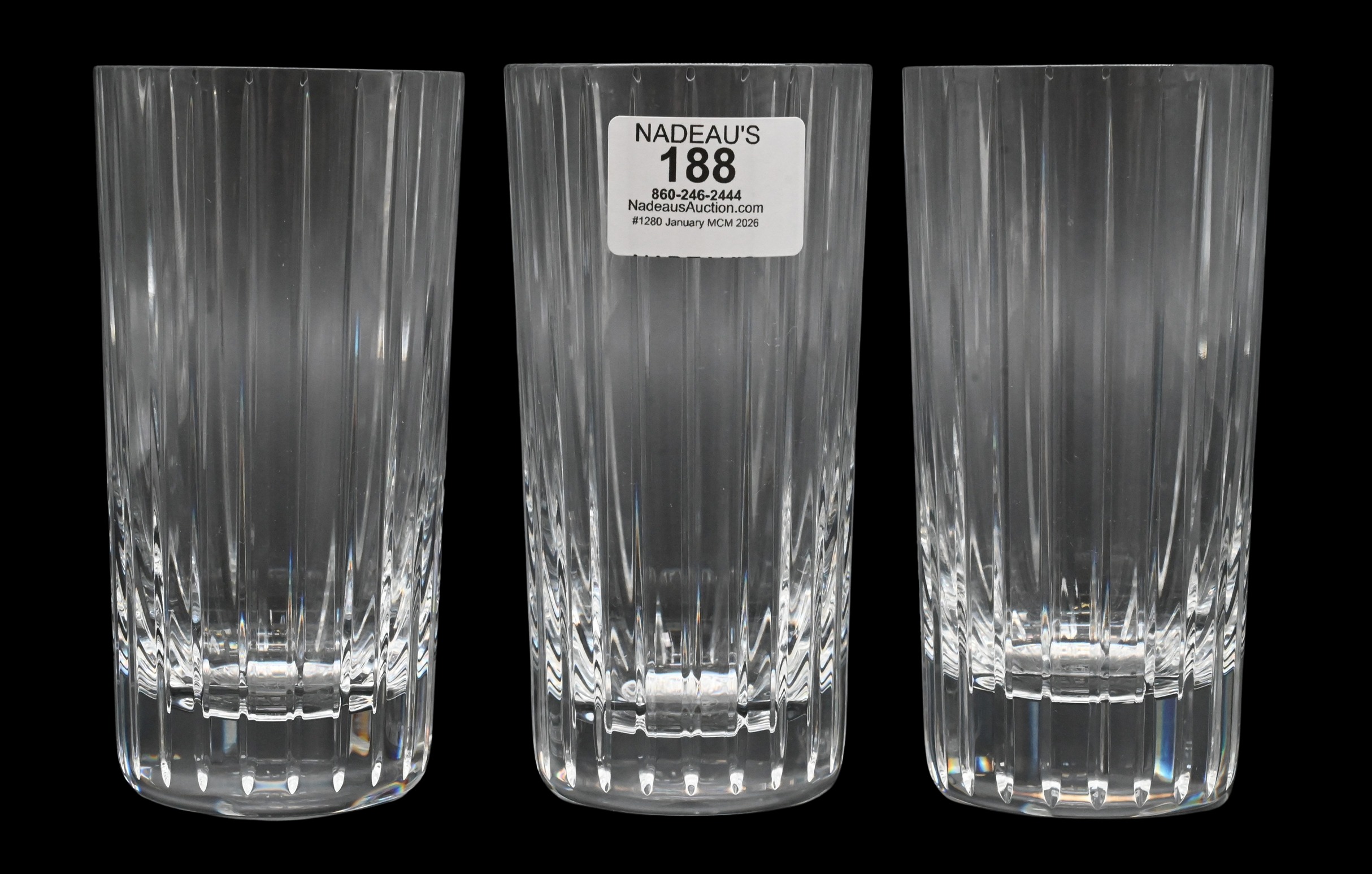 brilliantly cut clear crystal highball glasses in a vertical fluted pattern, each with the expected Baccarat clarity and weight, some in original boxes, etched Baccarat mark to base