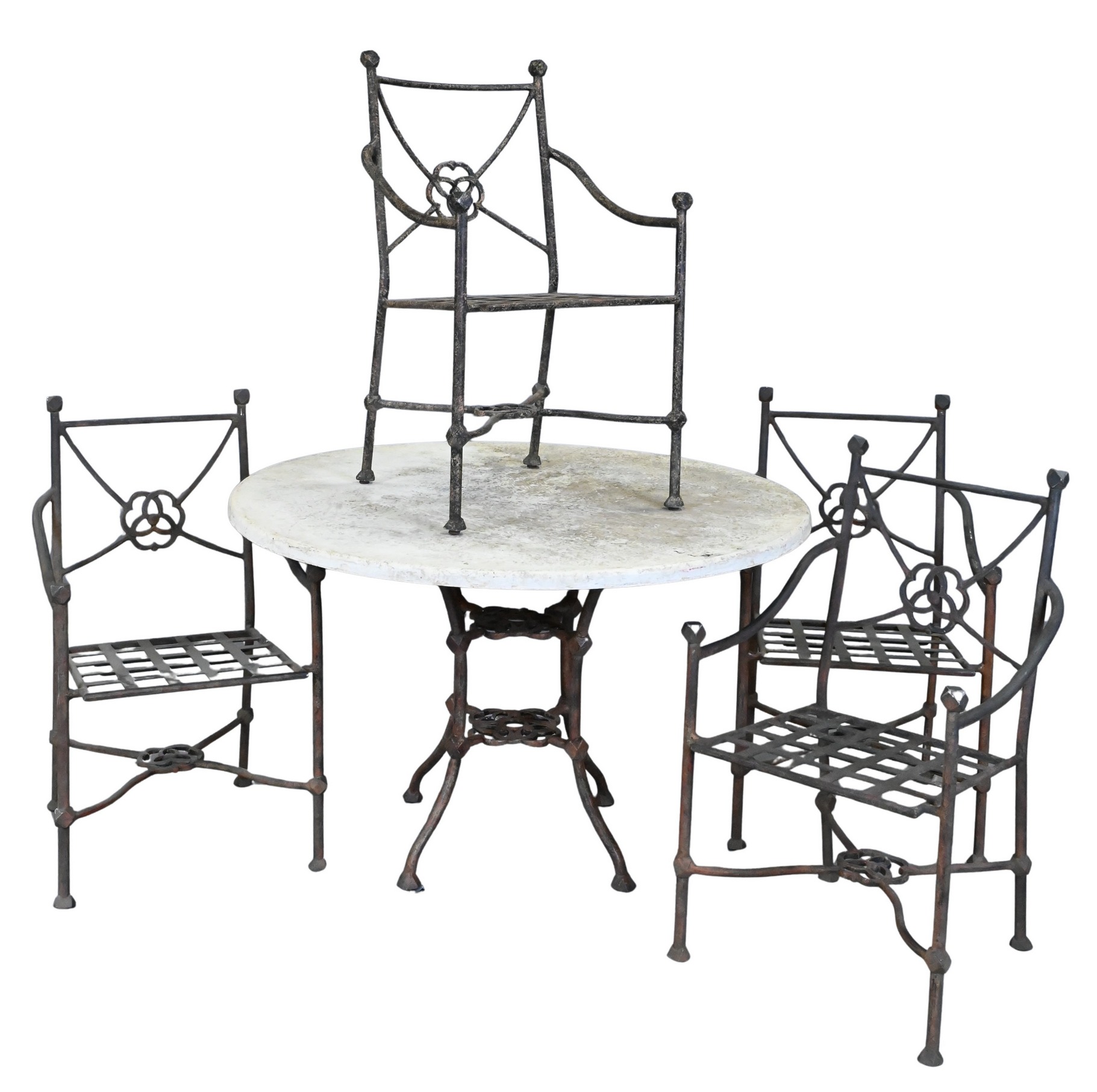 to include a round table and four metal arm chairs