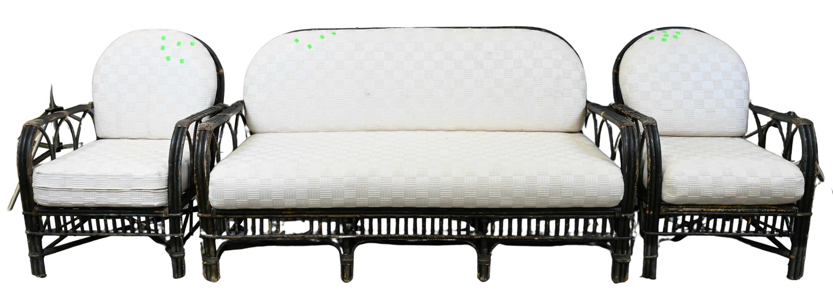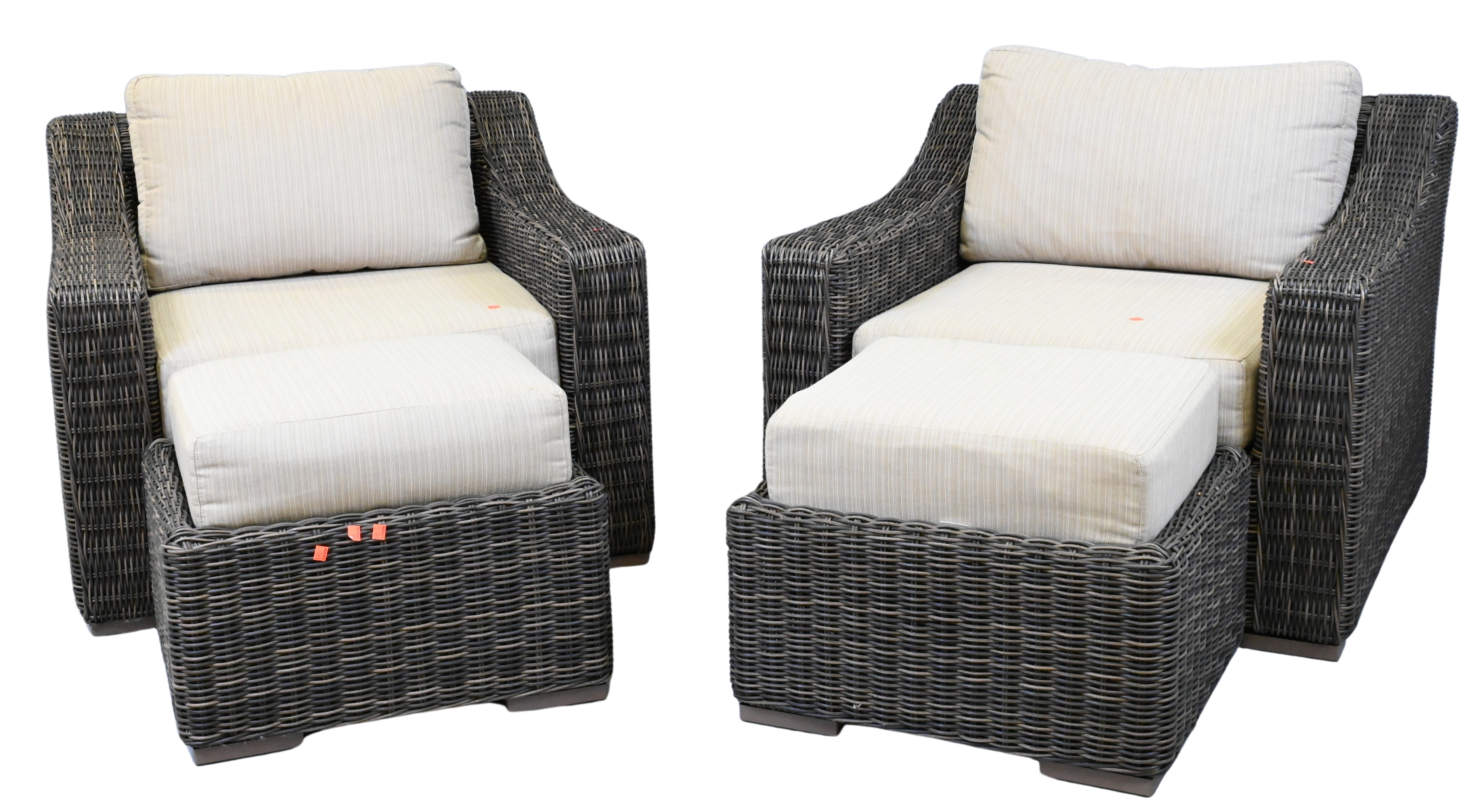 with Sunbrella upholstered cushions, sofa, pair of armchairs, pair of ottomans and metal coffee table