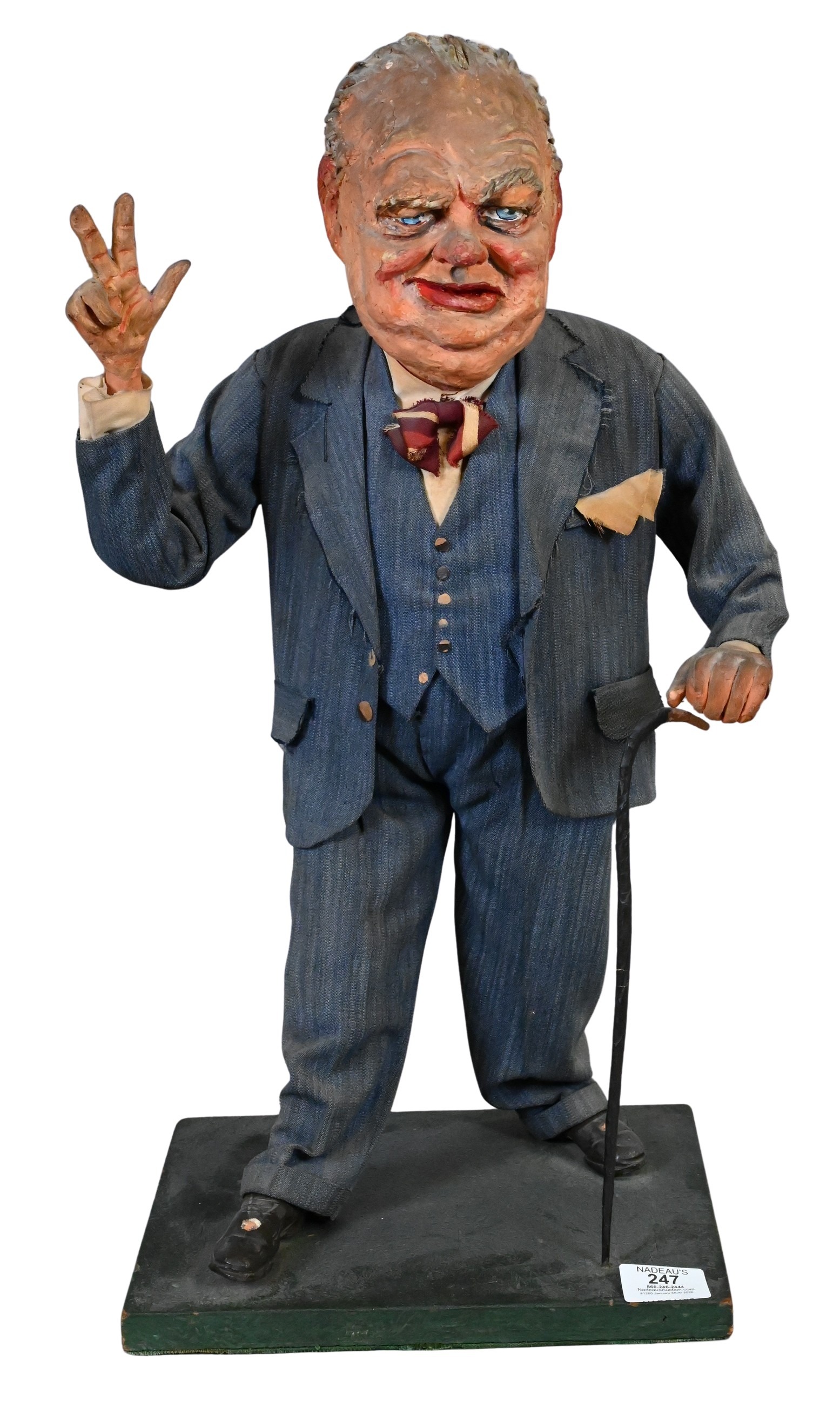 20th century, shown in a humorous caricature style with exaggerated facial features, dressed in a three-piece pinstripe suit with bow tie and pocket square the figure stands with cane in hand and makes the iconic V-sign gesture closely associated with this leader, painted with textured surface detail and mounted on a rectangular base, minor wear and paint losses consistent with age