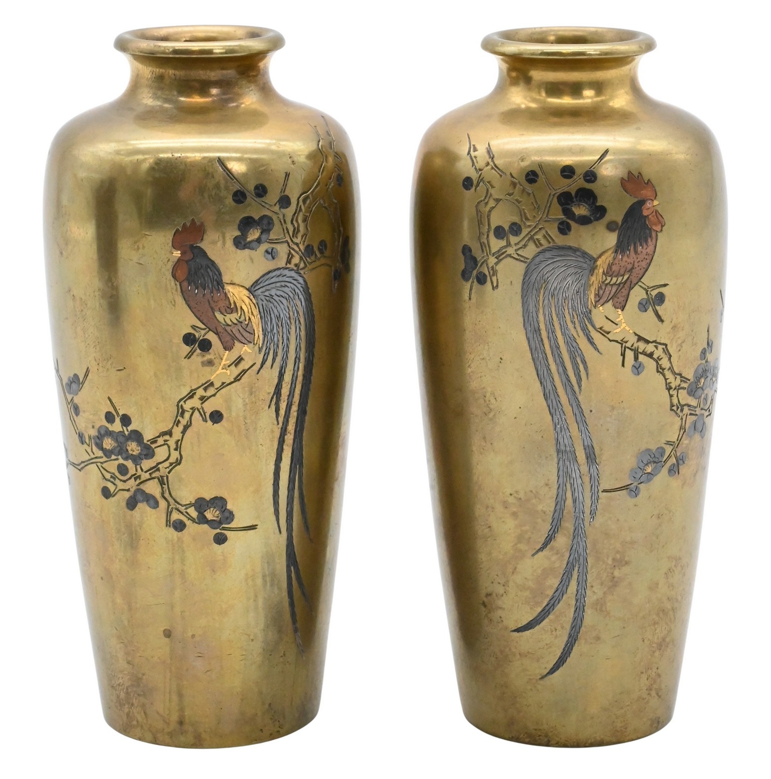 one decorated with birds and flowers, the other decorated with flowers, one marked on bottom