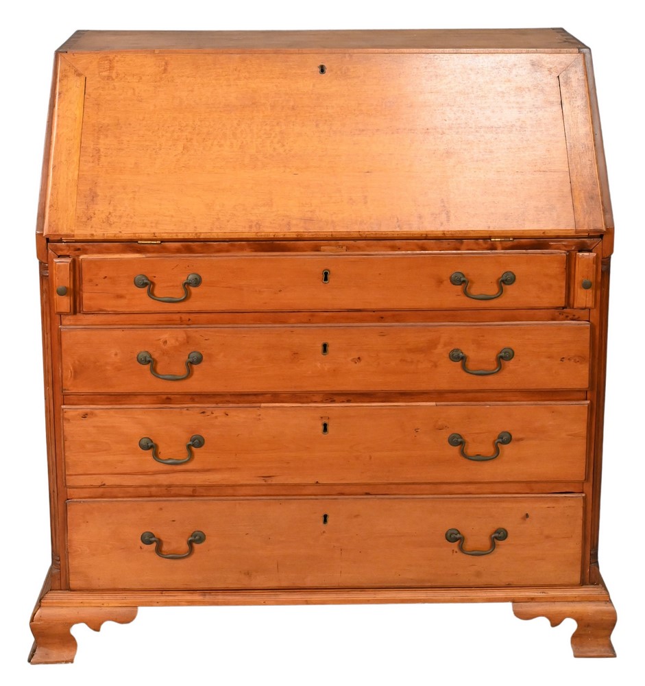 Chippendale Maple Slant Lid Desk, having fitted interior over four graduated drawers ending in ogee feet, height 42 inches, width 39 inches, depth 22 inches. Provenance: Estate of Florence Yannios, Waterfront Home, Guilford, CT.