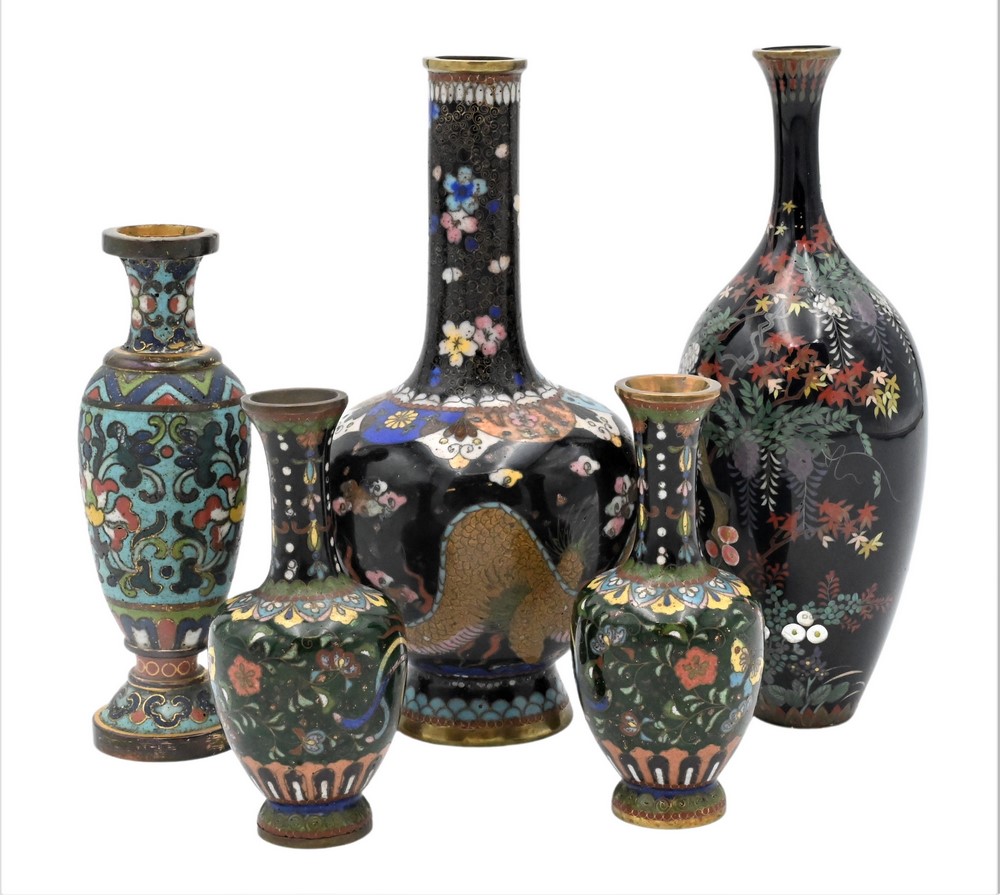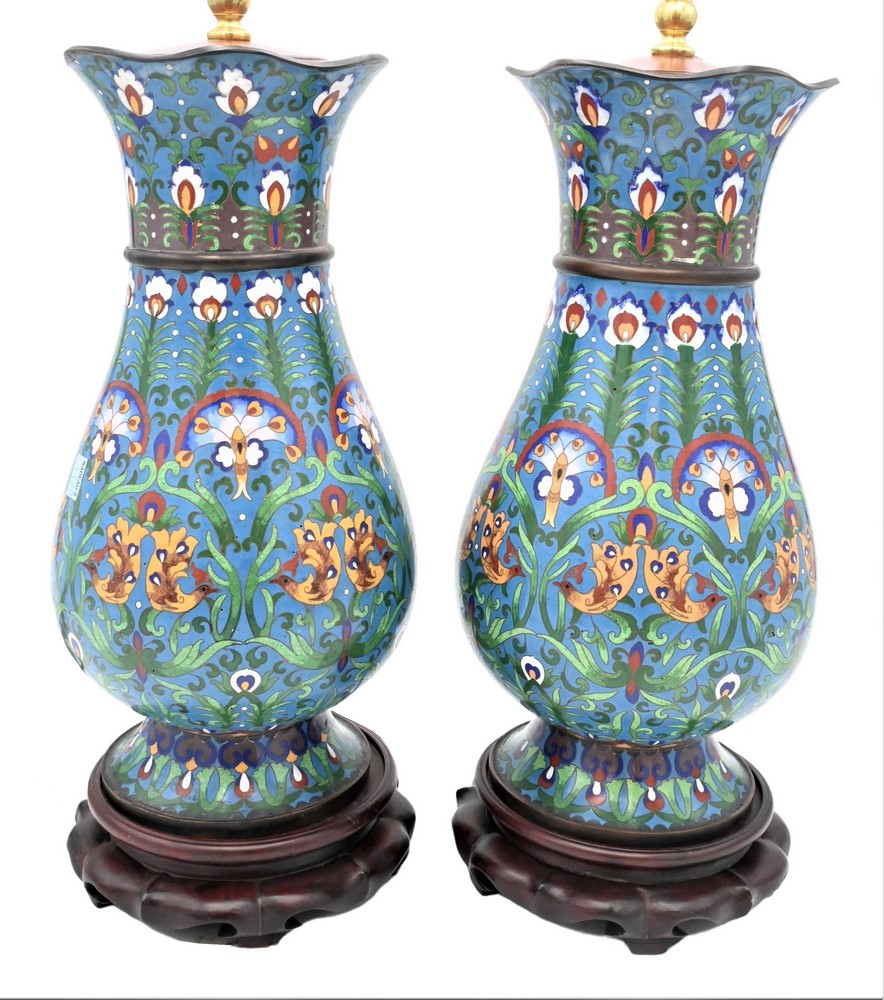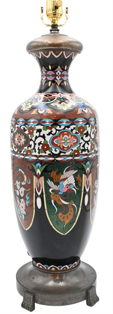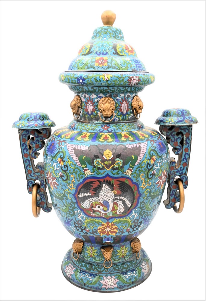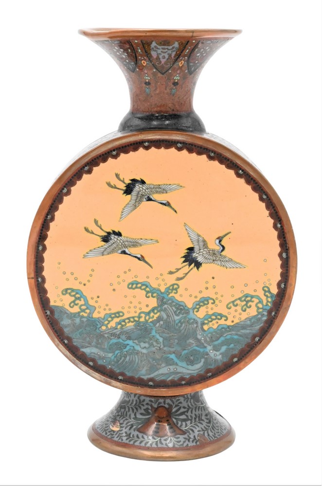 Cloisonne Moon Vase, having cranes, waves, butterflies, and flowers, (damage on one side and dent on foot, slight imperfection on toe), height 7 1/2 inches.