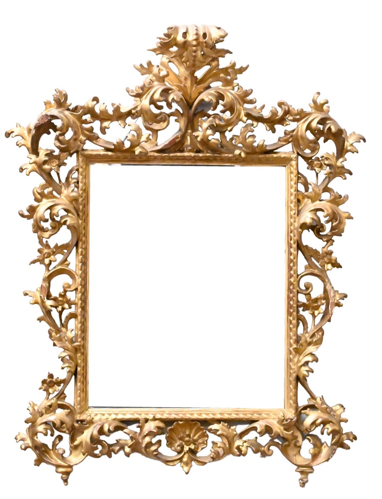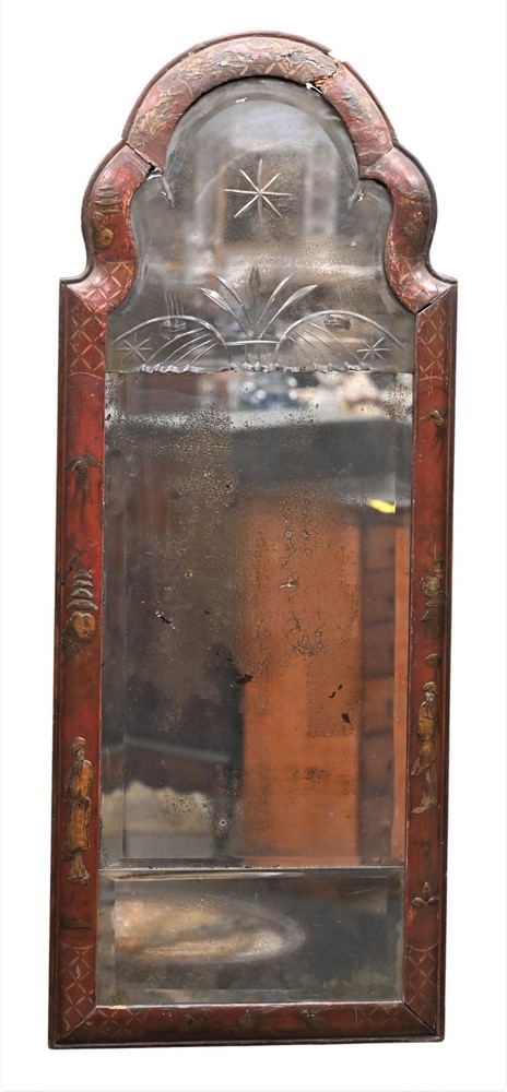 Rare William III Carved Chinoiserie Decorated Pier Mirror, in three parts, divided upright arched mirror plate, paint and wood damage at top, engraved at center with star and basket of flowers over scalloped edge in conforming frame, red japanned border, having raised figures of people and birds, height 42 inches. Provenance: Lillian Blankley Cogan, 1988. Estate of Wallace Bradway, New Haven, CT.