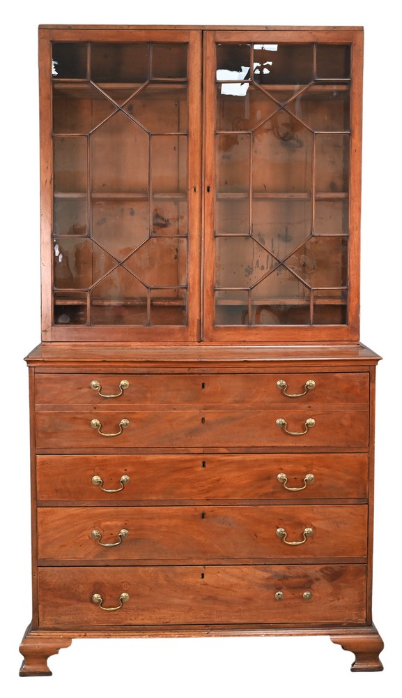 Chippendale Mahogany Butlers Secretary Desk, in two parts, upper section with two glazed doors, lower section with pullout desk over three drawers, on ogee feet, New England circa 1780, (top cornice molding missing), height 99 5/8 inches, width 47 1/2 inches, depth 22 5/8 inches, Mabel Brady Garvan Collection. Provenance: Francis P. Garvan (1875 – 1937), New York; gift to Yale University Art Gallery, New Haven, Connecticut, 1930.
