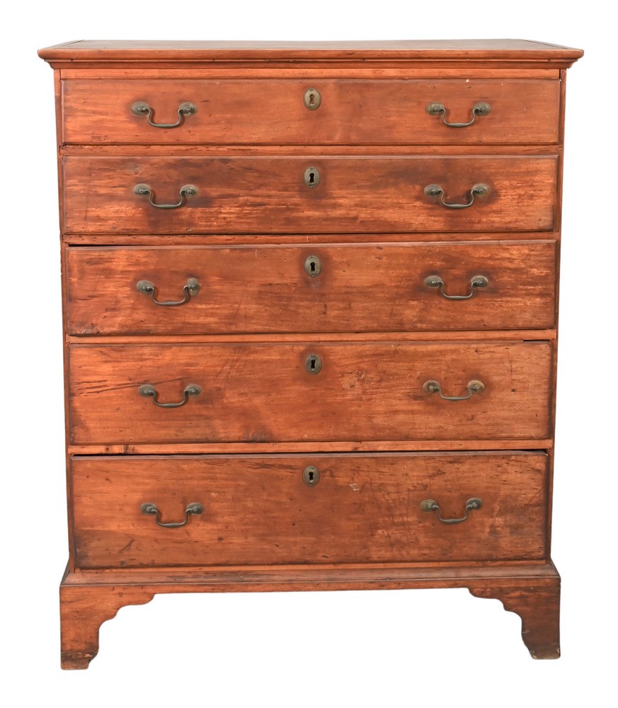Chippendale Maple Tall Chest, having molded top over five graduated drawers, on bracket feet, probably Rhode Island, circa 1770, height 46 inches, width 36 inches. Provenance: Estate of Florence Yannios, Waterfront Home, Guilford, CT.