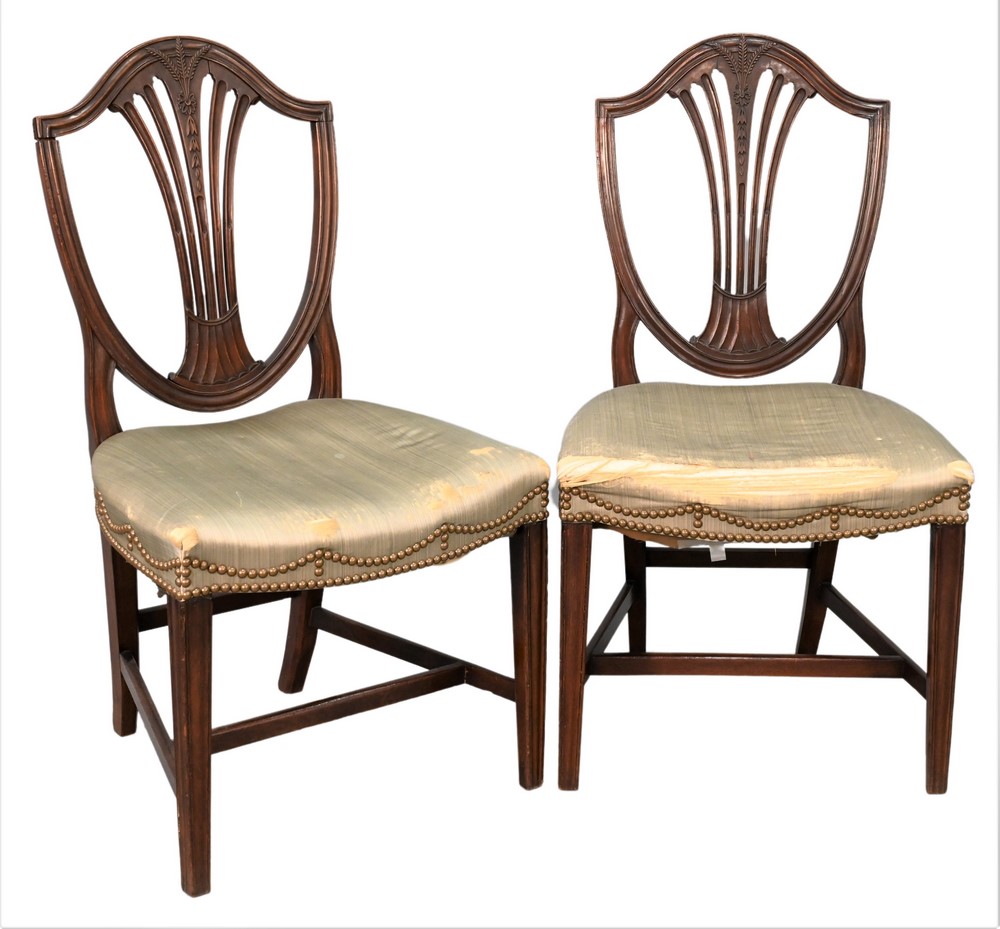 Pair of Hepplewhite Mahogany Side Chairs, mahogany with ash front and side seat rails and beech rear seat rail, each with shield shaped backs with carved wheat, fully upholstered seats, set on square tapered molded legs, circa 1800, American or English, Mabel Brady Garvan Collection., height 37 1/4 inches. Provenance: J. K. Beard, Richmond, Virginia; sold to Francis P. Garvan (1875–1937), New York; gift to Yale University Art Gallery, New Haven, Conn., 1930.