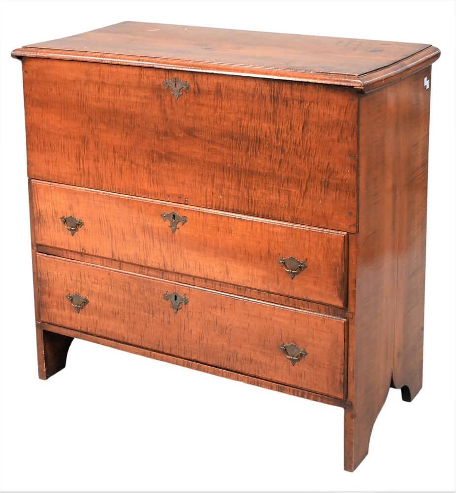 Tiger Maple Blanket Chest, having lift top over two drawers, set on boot jack ends, original snipe hinges and hardware, circa 1750, made in Massachusetts, maple, eastern white pine, drawer linings and back boards (by microanalysis), height 36 inches, width 36 1/2 inches, Mabel Brady Garvan Collection. Provenance: Jacob Margolis (born Russia, probably 1875), New York; consigned to Anderson Galleries, November 8, 1924, lot 508; sold to Francis P. Garvan (1875–1937), New York; by gift to Yale University Art Gallery, New Haven, Conn., 1930.