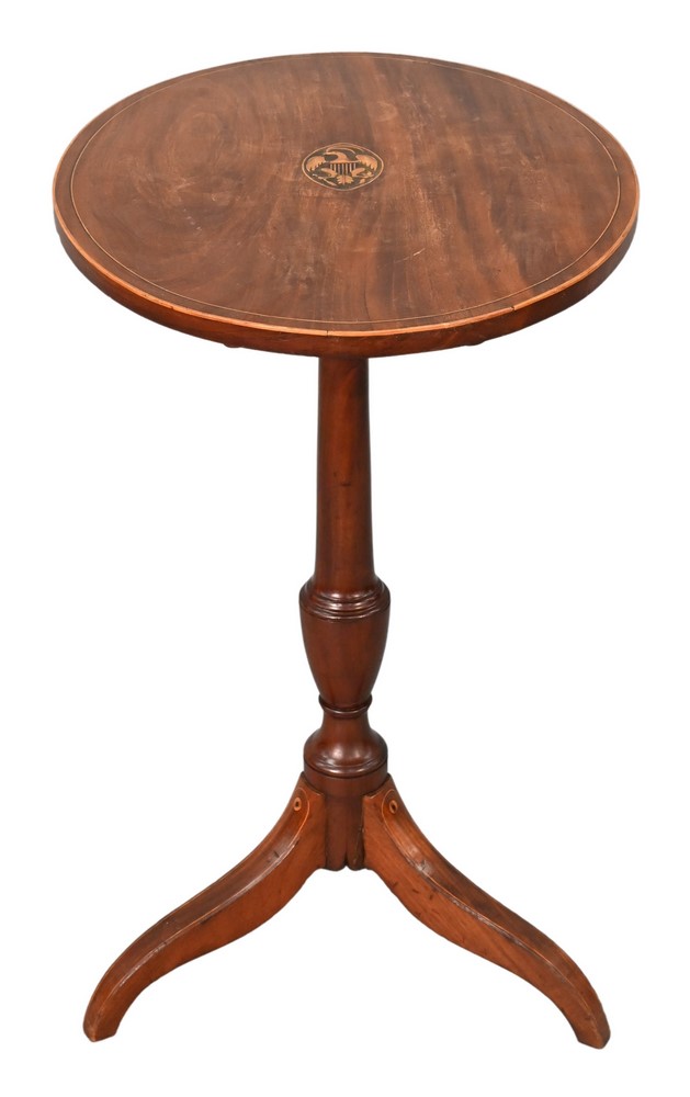 Federal Mahogany Tip Stand, eagle center panel inlay and line inlays, having oval top on urn turned shaft set on inlaid tripod base, made in New Jersey, 1900 – 1920, height 28 3/8 inches, width 16 5/8 inches, top height (up) 40 3/4″ inches, Mabel Brady Garvan Collection. Provenance: Jacob Margolis, New York; sold in October of 1024 to Francis P. Garvan (1875 – 1937), New York; gift to Yale University Art Gallery, New Haven, Connecticut, 1930.
