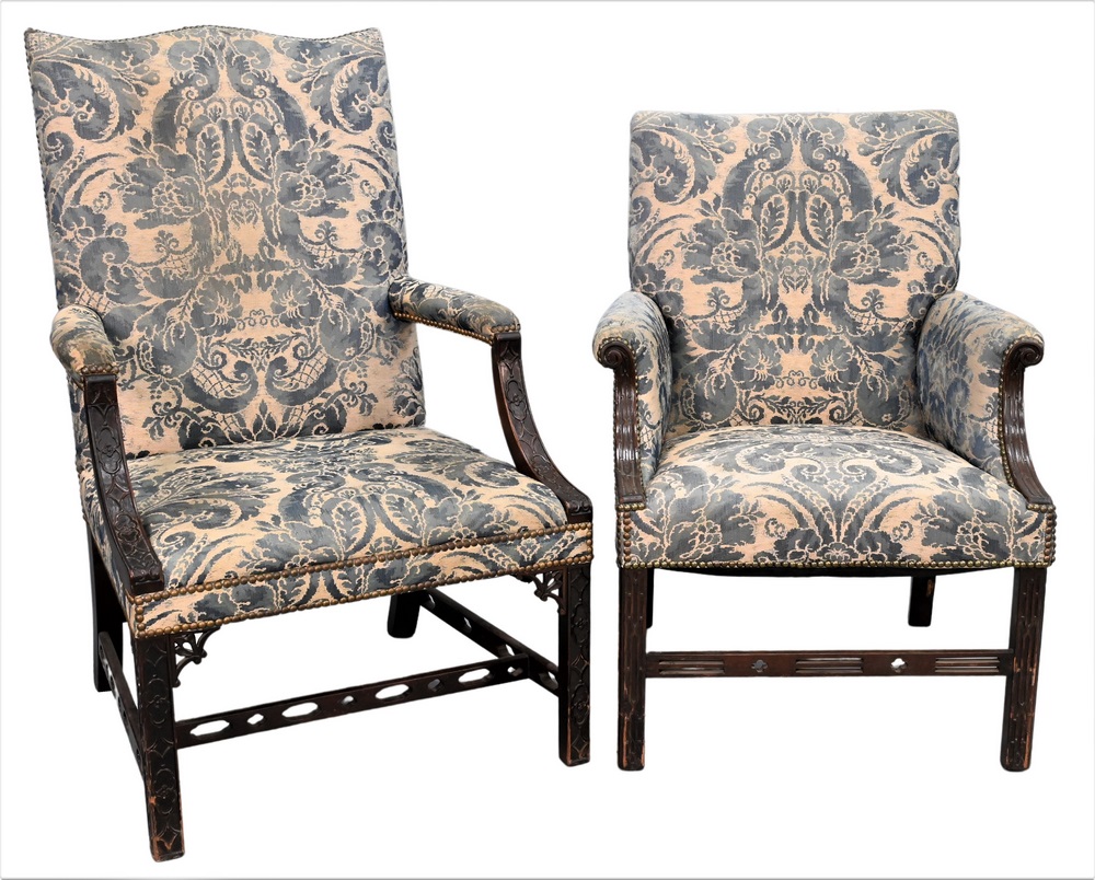 Two Mahogany Chippendale Upholstered Arm Chairs, each having pierced stretchers, one is 18th century probably English, one stretcher off. Provenance: Estate of Wallace Bradway, New Haven, CT.