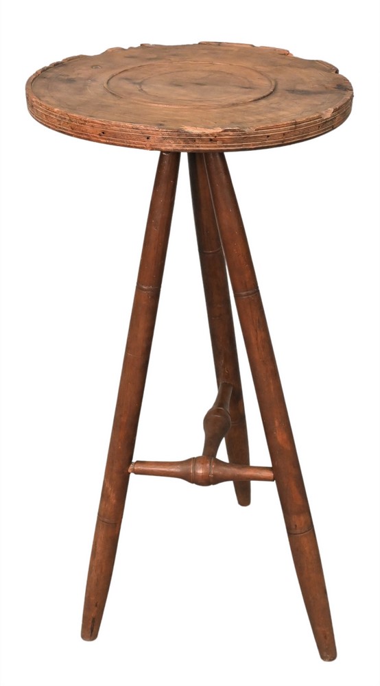 Walnut Candle Stand, having turned round top on three simple turned legs, supported by turned stretchers, (chips in top), height 27 1/16″, top 13 1/2″ x 13 7/8″; Mabel Brady Garvan Collection. Provenance: A. J. Pennypacker, Pennsburg, Pa.; consigned to auction May 22–24, 1930, Pennsburg, Pa., sold to Jacob Margolis, acting as agent for Francis P. Garvan (1875–1937), New York; gift to Yale University Art Gallery, New Haven, Conn., 1930.