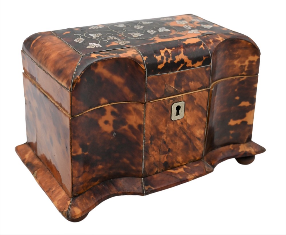 English Tortoise Shell Tea Caddy, having serpentine front, along with mother of pearl inlaid grape vines on top opening to two compartments, height 5 inches, width 7 1/2 inches, depth 4 1/2 inches.
