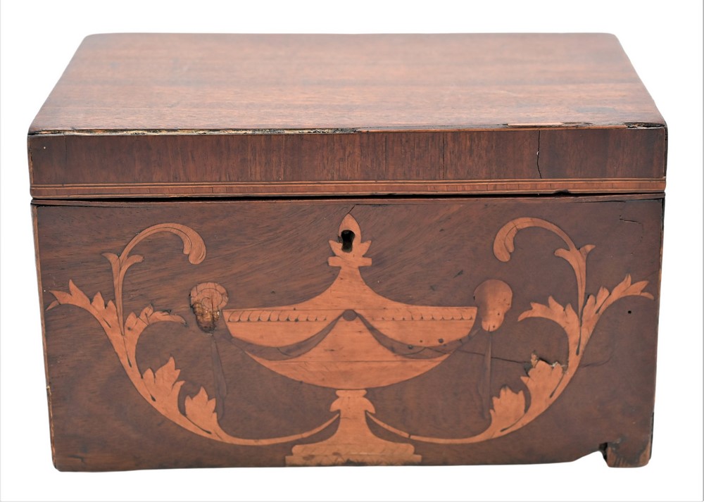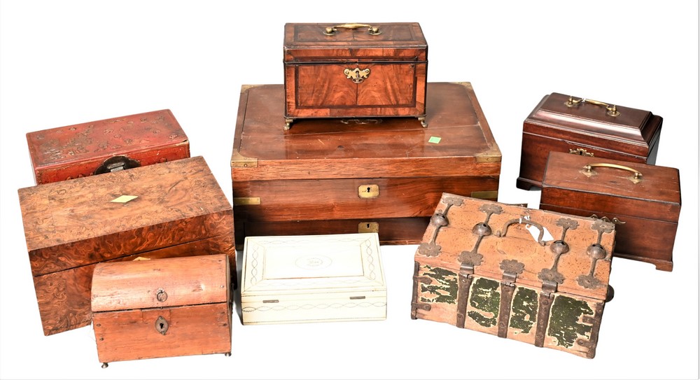 Nine Boxes, to include 17th – 18th century, metal mounted lockbox; mahogany boxes; inlaid box; Chinese box, 19th century; ivory mounted box; mahogany brass bound with fitted tray interior over one drawer; tallest 6 1/2 inches, top 12″ x 17″. Please note: Items containing ivory cannot be purchased or shipped by bidders residing outside of the United States or California, Hawaii, Nevada, New Jersey, New York, Washington, Oregon, or District of Columbia. If an ivory item is purchased by a bidder in one of the above mentioned locations or attempts to ship ivory to one of the above mentioned locations, bidder will forfeit the item and be responsible for any incurred fees such as a restocking fee.