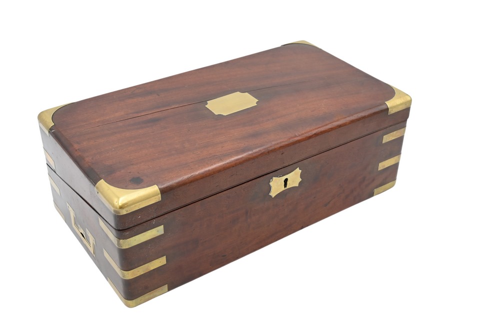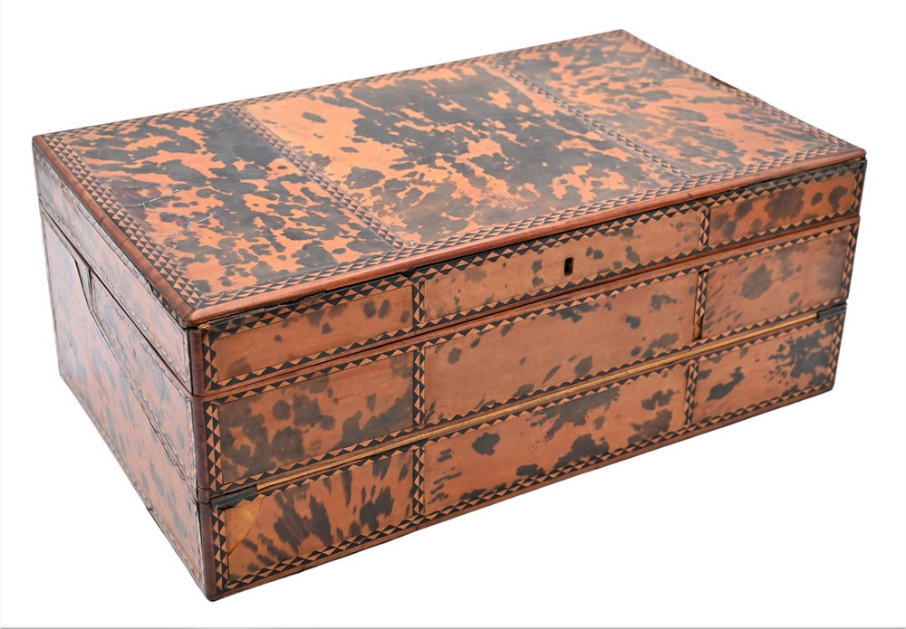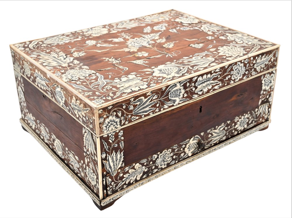 Mahogany Inlaid Lap Desk, having ivory inlaid blossoming flowers and vines, opening to a fitted interior, height 7 1/2 inches, top 12 1/2″ x 16″. Please note: Items containing ivory cannot be purchased or shipped by bidders residing outside of the United States or California, Hawaii, Nevada, New Jersey, New York, Washington, Oregon, or District of Columbia. If an ivory item is purchased by a bidder in one of the above mentioned locations or attempts to ship ivory to one of the above mentioned locations, bidder will forfeit the item and be responsible for any incurred fees such as a restocking fee.