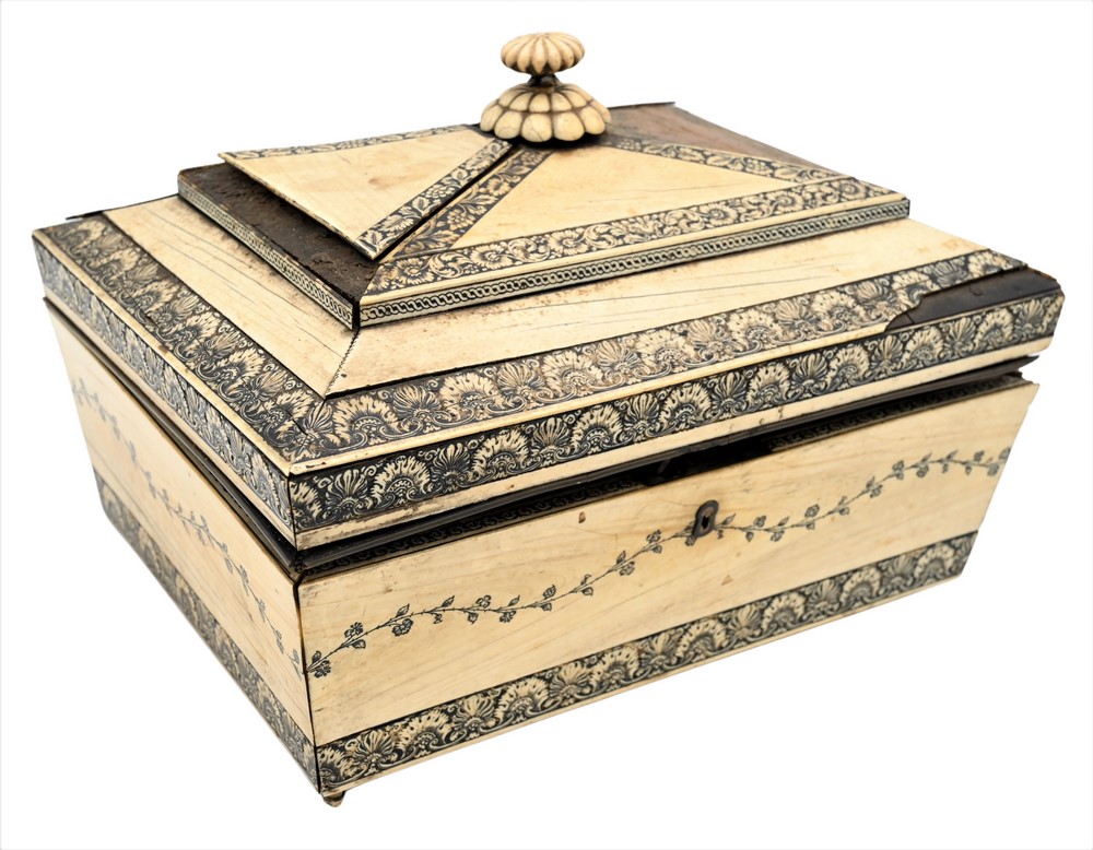 19th Century Box, mounted with ivory, circa 1860, some parts missing, top 9 1/2″ x 12 1/2″. Please note: Items containing ivory cannot be purchased or shipped by bidders residing outside of the United States or California, Hawaii, Nevada, New Jersey, New York, Washington, Oregon, or District of Columbia. If an ivory item is purchased by a bidder in one of the above mentioned locations or attempts to ship ivory to one of the above mentioned locations, bidder will forfeit the item and be responsible for any incurred fees such as a restocking fee.