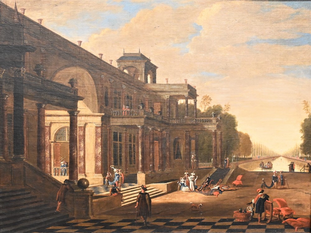 Attributed to Jacob Ferdinand Saeys (Flemish, 1658 – 1726), palace and garden with elegant figures, oil on canvas, 26″ x 34 1/2″, unsigned, relined and restretched. Provenance: Purchased by Ernest and Lydia Joresco, Chicago, IL, March 9, 1974, no receipt available, old paper label on back. Estate of Wallace Bradway, New Haven, CT.