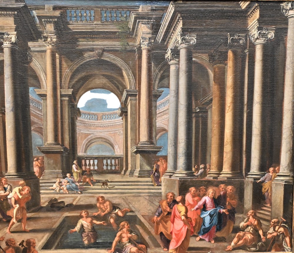 Artist Unknown, Italian School, 18th century, Christ at the Pool of Bethesda, oil on canvas, (relined), unsigned, 23 7/8″ x 27 7/8″. Provenance: Purchased by David Burns, Chicago, January 18, 1973, (no receipt available). Estate of Wallace Bradway, New Haven, CT.