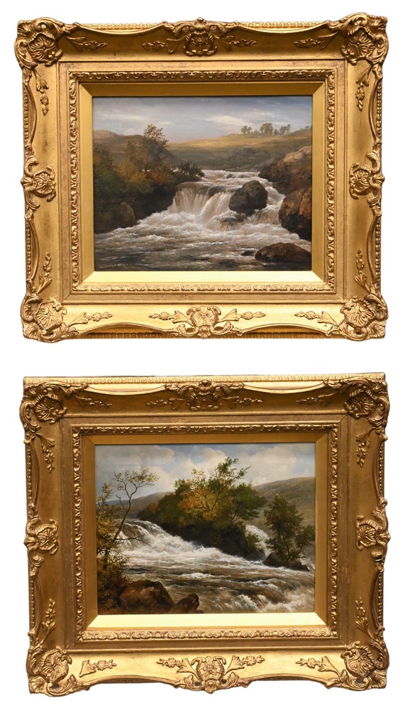 Edmund Gill (England, 1820 – 1894), pair of paintings, each titled “Waterfall” and dated 1885, oil on canvas, sight size 8″ x 10″, gilt frames 13 1/2″ x 15 1/2″. Provenance: Sold at David Brooker Fine Art, 3/3/11, with copy of receipt.
