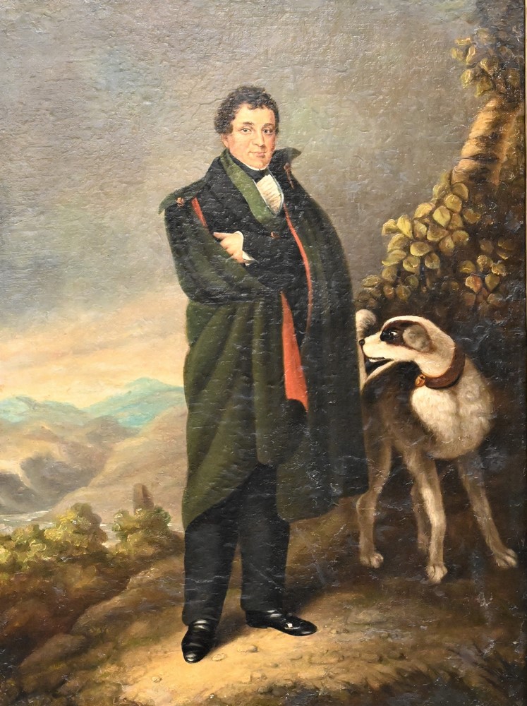 English School, 19th century, portrait of Daniel O’Connell, circa 1840, full length portrait accompanied by white hound, oil on canvas, sight size 24″ x 18″. Provenance: Christie’s East (New York) sale #7831, 1/9/96, lot 165.