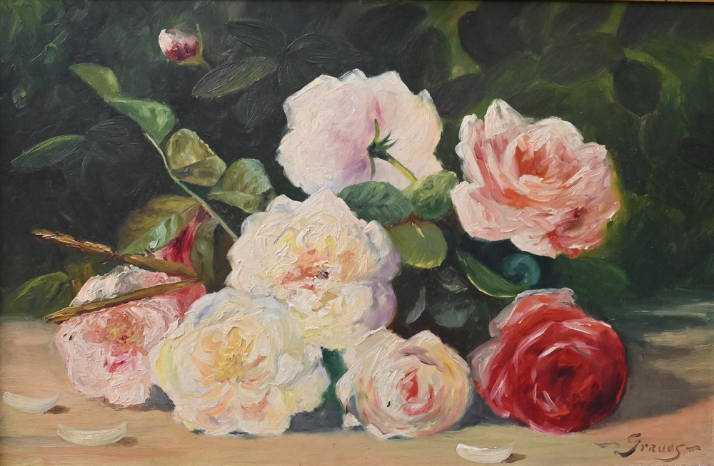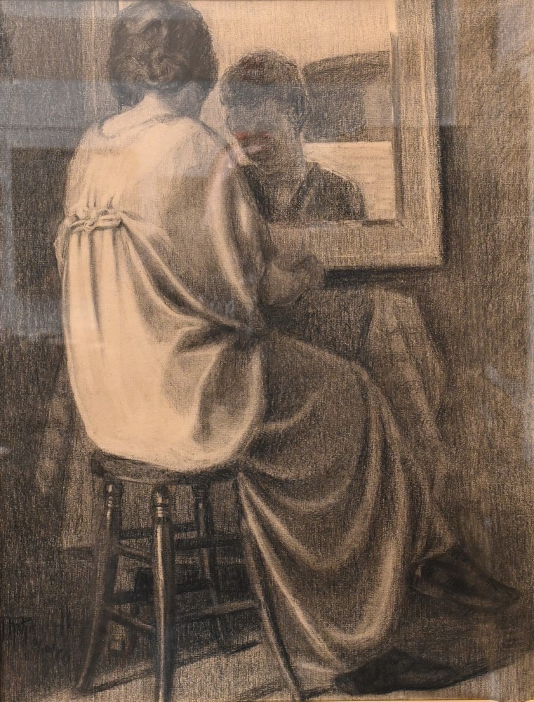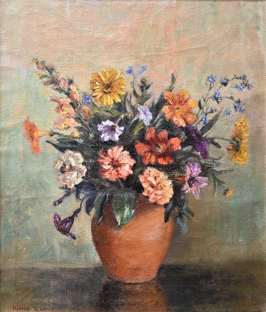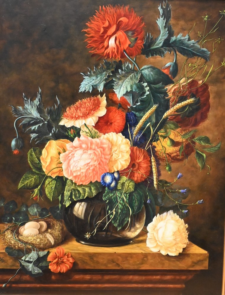 TM, Still Life with Flowers in a Vase and Bird’s Nest, initialed with a conjoined monogram “TM” recto, lower left, sight size 24 1/2″ x 19″. Provenance: Kurt Schon Fine Art (label verso), May 3, 1995.