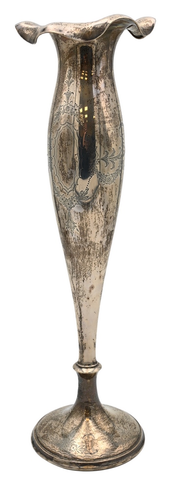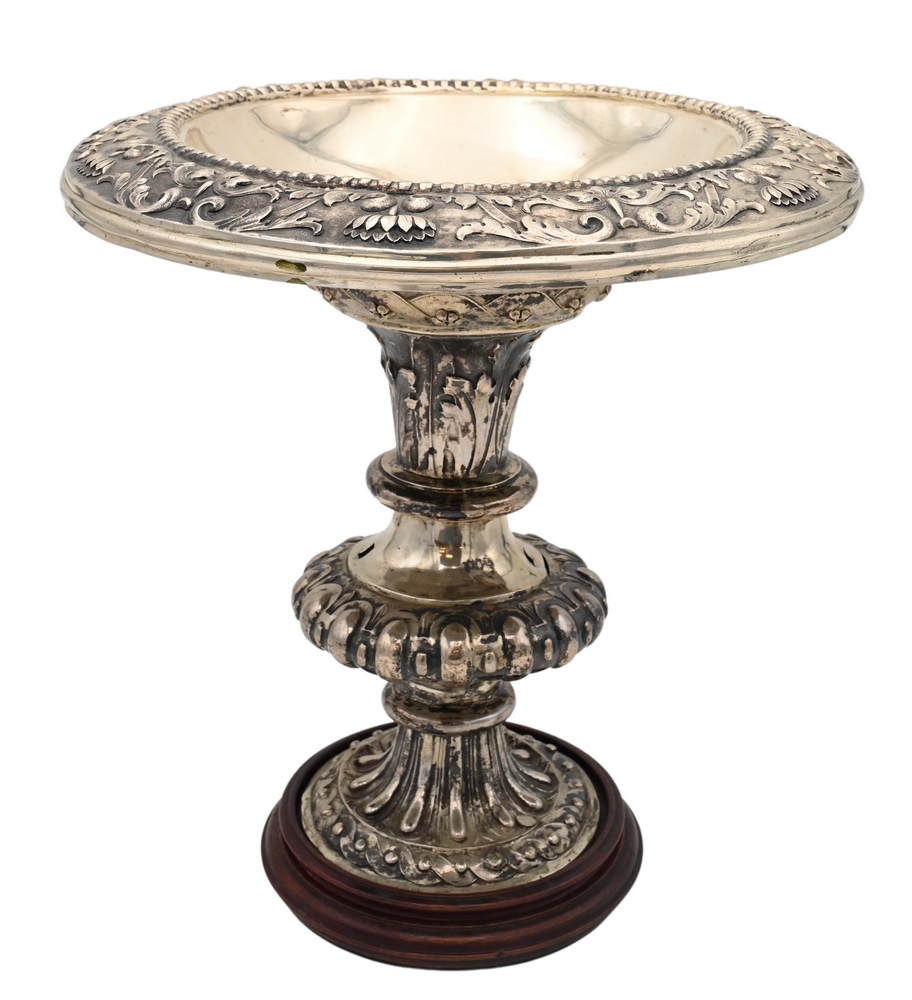 Continental Silver Compote, monogrammed To John Grant as her Majesty’s Inspector of Police 1872, handles missing, height 13 1/2 inches, net 49 t.oz. without base.