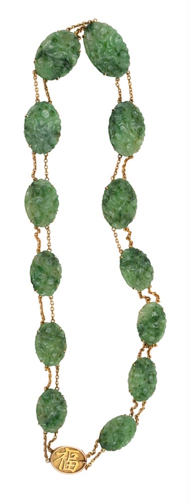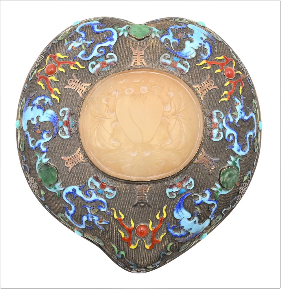 Chinese Silver Enameled Gourde Box, in the form of a gourde or heart, having carved jade plaque mounted on the lid, surrounded by enameled phoenix birds, dragons and bats, amongst flaming clouds, body also decorated with turquoise hardstone, jadeite cabochons, height 3 inches, width 6 1/4 inches.