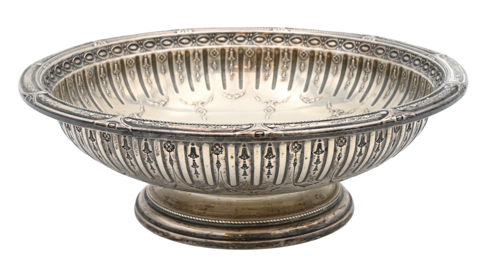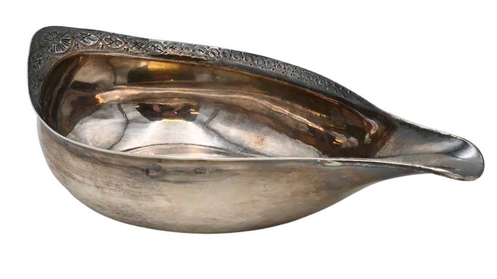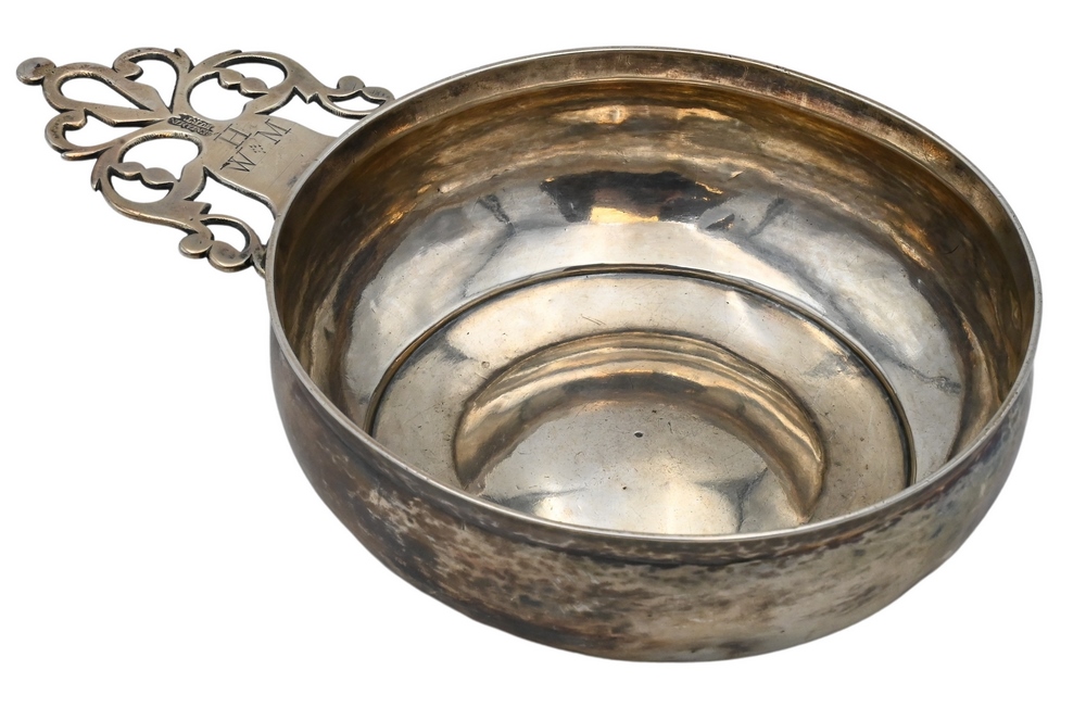 Benjamin Burt (Boston, 1729 – 1803), silver porringer having open work handle, inscribed with initials WMH, height 2 inches, diameter 5 1/2 inches, 7.6.t.oz.