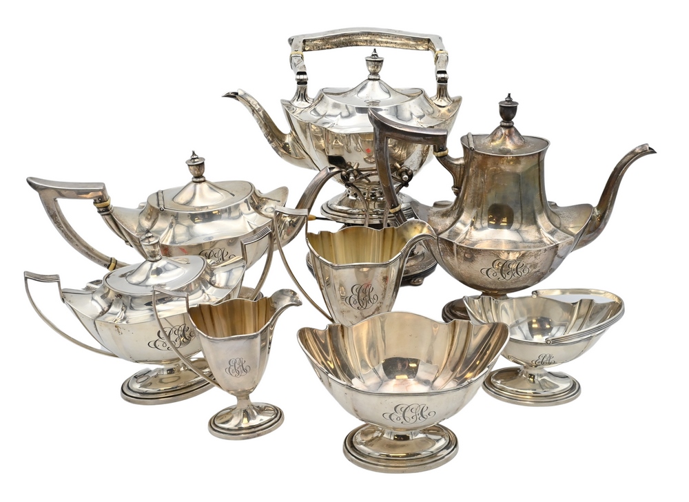 Eight Piece Sterling Silver Tea and Coffee Set, by Gorham, to include a tilting hot water pot, height 8 1/4 inches without handle; coffee pot; teapot, covered sugar; waste bowl; small handled basket; along with two creamers; (monogrammed); 127 t.oz. Provenance: An estate from Redding, CT.