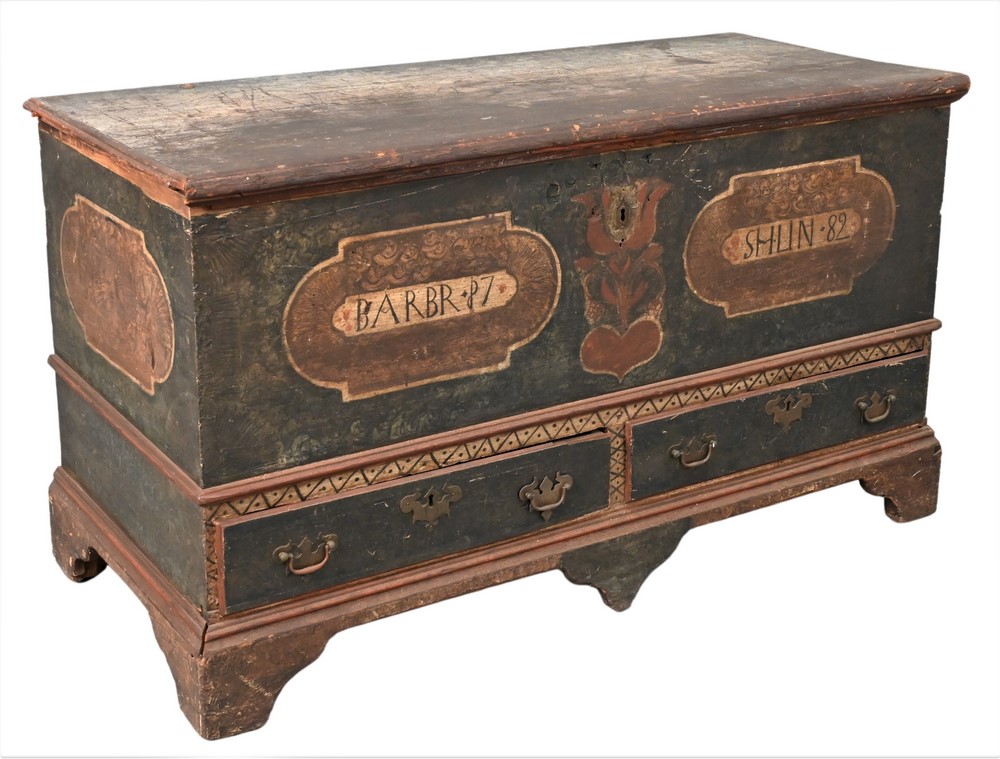 Lift Top Dowry Chest, having original painted panels, red tulip and heart, Barber 87 and Shlin 82 in panels, over two drawers with center drop and bracket feet, all over sponge painted with panels and fans, interior with till and three drawers, Pennsylvania, late 18th century, height 28 inches, top 22″ x 49 1/2″. Provenance: Estate of Florence Yannios, Waterfront Home, Guilford, CT.