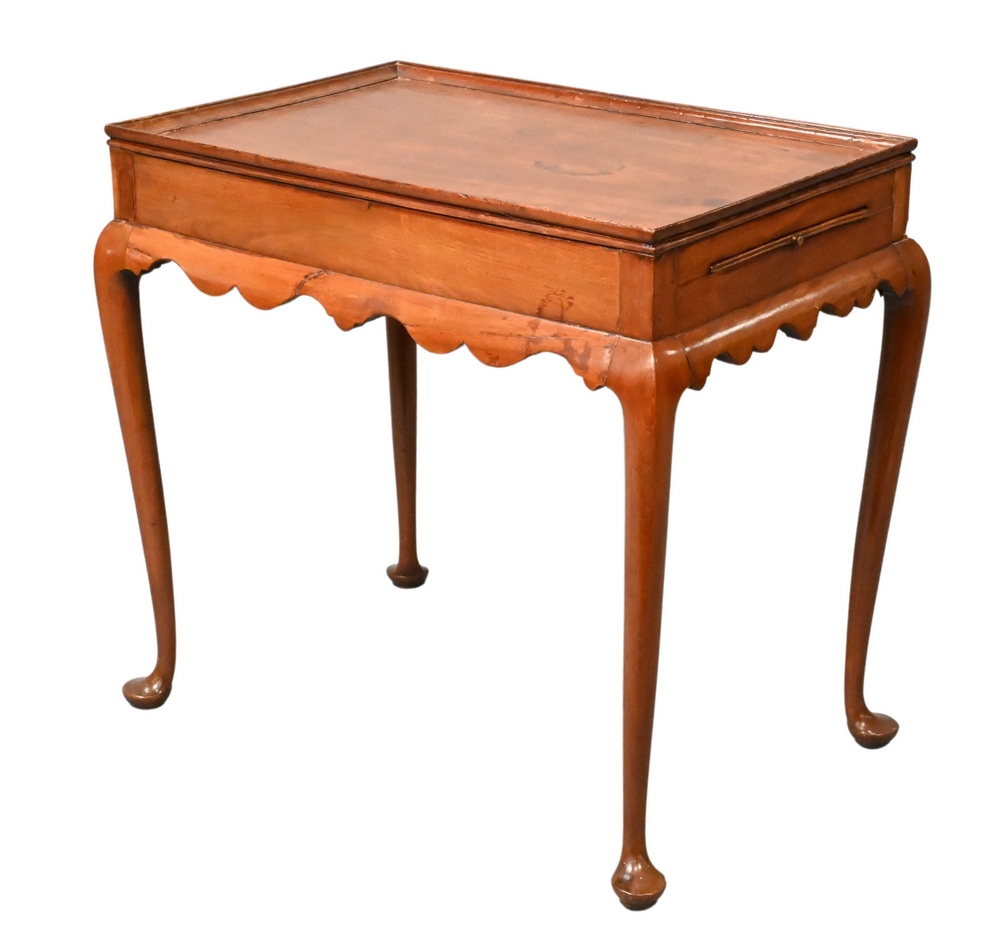 Queen Anne Mahogany Tea Table, having rectangle dished top, two candle slides over scalloped apron, all set on cabriole legs ending in pad feet, probably Boston, circa 1750, (one leg repaired), mahogany and yellow-poplar (glue block residue on front rail), top 28 1/8″ × 18 7/16″, bequest of Olive Louise Dann., candle slides and supports replaced. Provenance: Olive Louis Dann (1880–1961), New Haven, Conn., bequest to Yale University Art Gallery, New Haven, Conn.,1961.