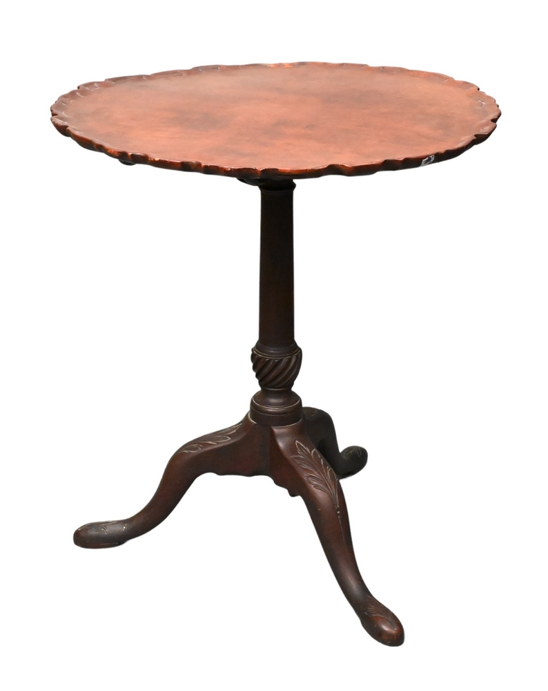 Mahogany Tip Table, having pie crust top on turned shaft, on tripod base, 18th century, height 26 1/2 inches, top 23″ x 23 1/2″. Provenance: Estate of Wallace Bradway, New Haven, CT.