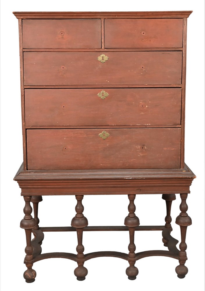 William & Mary Chest on Frame, pine and maple, in two parts, upper section with cornice molding, two drawers over three drawers, a double arch molding on stand with large molding, all set on turned legs and turnip feet, circa 1700, height 59 7/16 inches, width 39 inches, depth 20 inches, Mabel Brady Garvan Collection. Provenance: Francis P. Garvan (1875–1937), New York; gift to Yale University Art Gallery, New Haven, Conn., 1930.