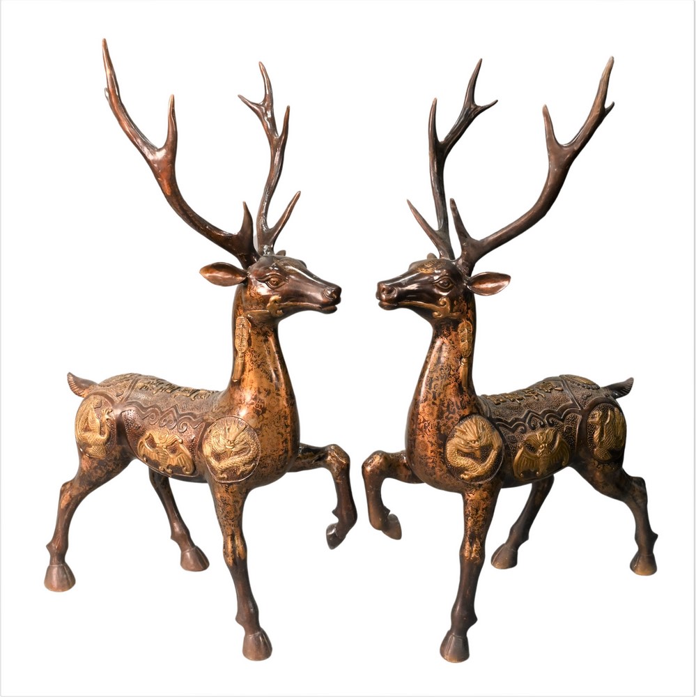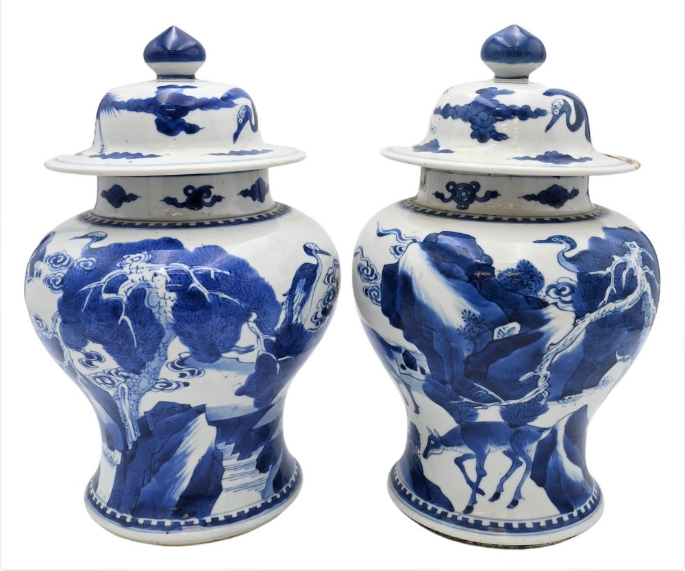 Pair of Chinese Blue and White Covered Temple Jars, 18th century, Kangxi period (1644 – 1722), decorated in vibrant cobalt blue with cranes and deer on stark white ground, unmarked with old repair to neck and each cover, height 14 inches.