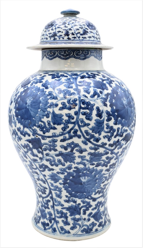 Chinese Blue and White Covered Temple Jar, 18th century, Kangxi period (1644 – 1722), baluster shape, decorated overall with chrysanthemum flowers and scrolling foliage, drilled base and restored finial, height 18 inches.