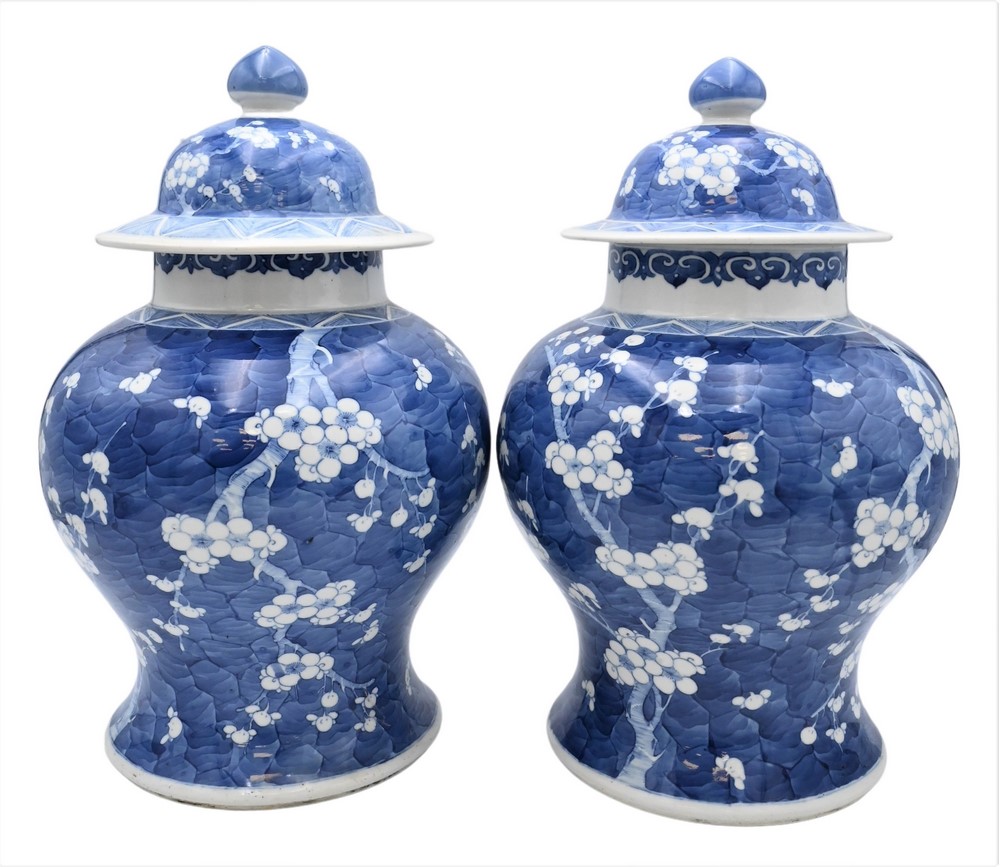Pair of Chinese Blue and White Covered Temple Jars, 19th century, baluster shape, decorated with white prunus flowers and branches on blue ground, height 17 1/2 inches.